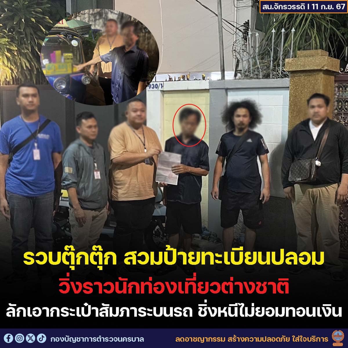 タイ警察は2024年9月10日、バンコクのマンゴン通りでアメリカ人客の荷物と現金を奪って姿を消した、トゥクトゥクの運転手(66歳)を逮捕しました。