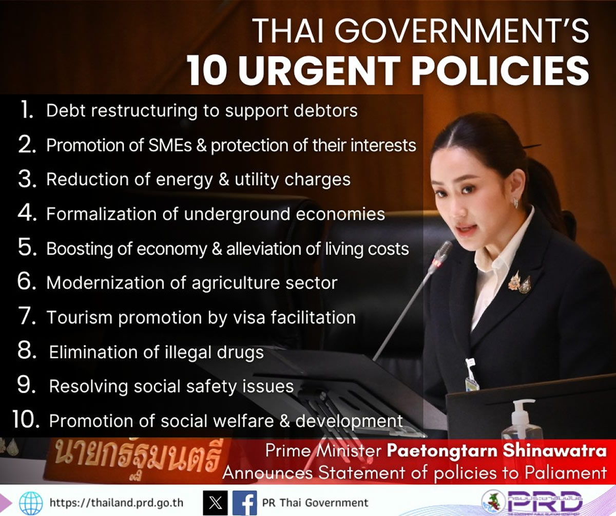ペートンタン・チナワット首相が率いるタイ政府は、以下の10の重要な政策を議会に発表しました。タイ政府広報局が2024年9月12日に伝えています。