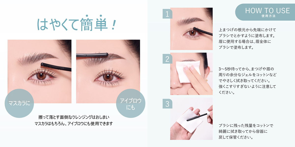まつ毛の根元から先端にかけてブラシでとかすように塗布します。眉に使用する場合は、眉全体にブラシで塗布します。3~5秒待ってから、まつ毛や眉の周りの余分なジェルをコットンなどでやさしく拭き取ってください。強くこすりすぎないように注意してください。ブラシに残った残量をコットンで綺麗に拭き取ってから容器に戻して保管ください。