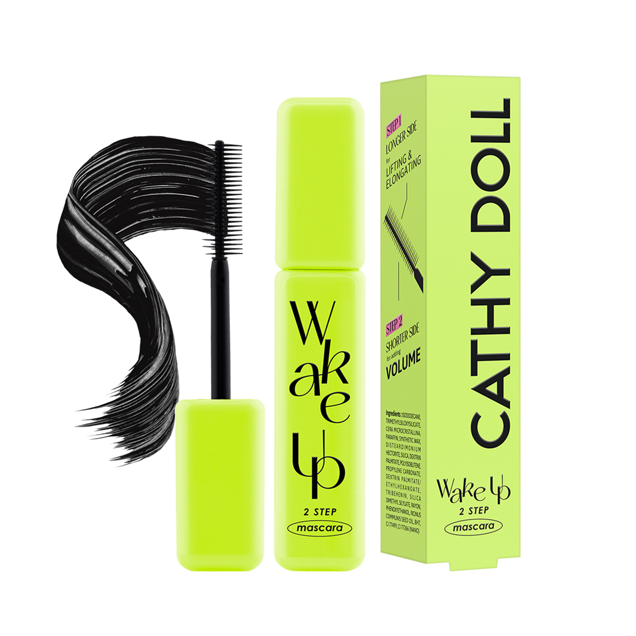 「Cathy Doll ウェイクアップマスカラ」は、“眠っているまつ毛を目覚めさせる”をコンセプトに開発された、簡単2ステップのマスカラです。独自開発のウルトラファイバーフィルム処方で、下地無しでもまつエク級の上向きバサバサ濃密まつ毛を演出。眠っているまつ毛に革命を起こします。