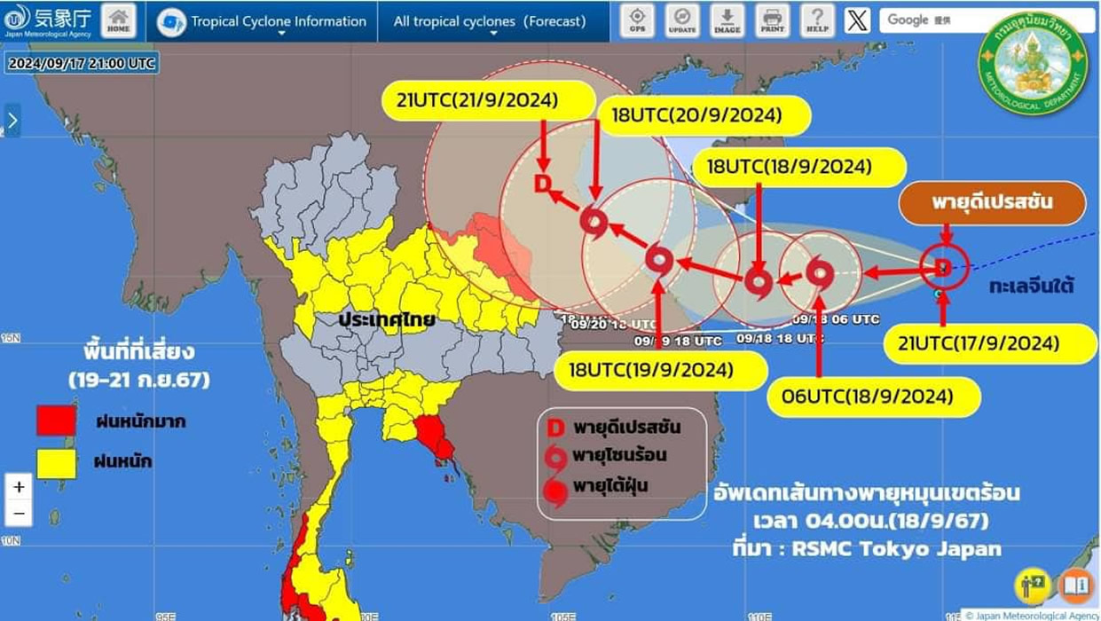 タイでは、2024年9月19日(木)に接近する熱帯低気圧に備えて、警戒が強まっています。大雨や鉄砲水、地滑りが予想されており、特に東北部が大きな影響を受けるとされています。タイ気象局は、南シナ海上で発達中の熱帯低気圧が台風に変わり、タイに接近するため、厳重な注意を呼びかけています。