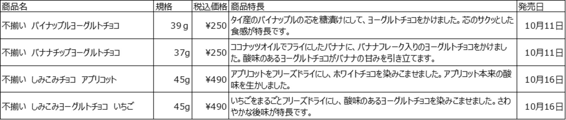 今回発売する不揃いチョコシリーズは、パイナップル、バナナチップにヨーグルト味のチョコレートをかけた「不揃い パイナップルヨーグルトチョコ」、「不揃い バナナチップヨーグルトチョコ」と、フリーズドライしたアプリコット、いちごの中にチョコレートをしみこませている「不揃い しみこみチョコ アプリコット」と「不揃い しみこみヨーグルトチョコ いちご」の4種類です。