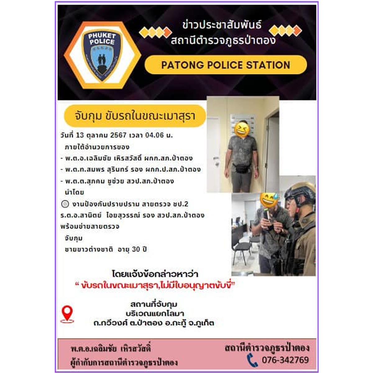 世界的なビーチリゾートであるタイ南部プーケットで、最も多くの外国人が集まるのがパトンビーチです。そんなパトンビーチで2024年10月13日午前4時頃、パトン警察署が飲酒運転の取り締まり中に30歳の外国人の男を逮捕しました。