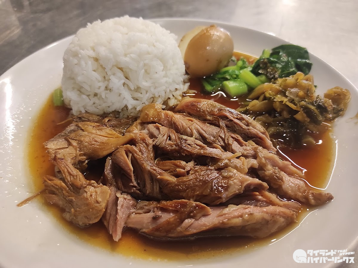 カオカームーは中国の潮州料理に由来し、豚足を香り高いスパイスの効いたスープでじっくり煮込み、薄くスライスして蒸しご飯の上に載せた料理です。ゆで卵や漬けカラシ菜など添えられます。この料理は、タイ国内外で幅広く愛されていますが、炭水化物や脂肪分が多く含まれているため、タイ健康財団は適度な摂取と食後の運動を推奨しています。