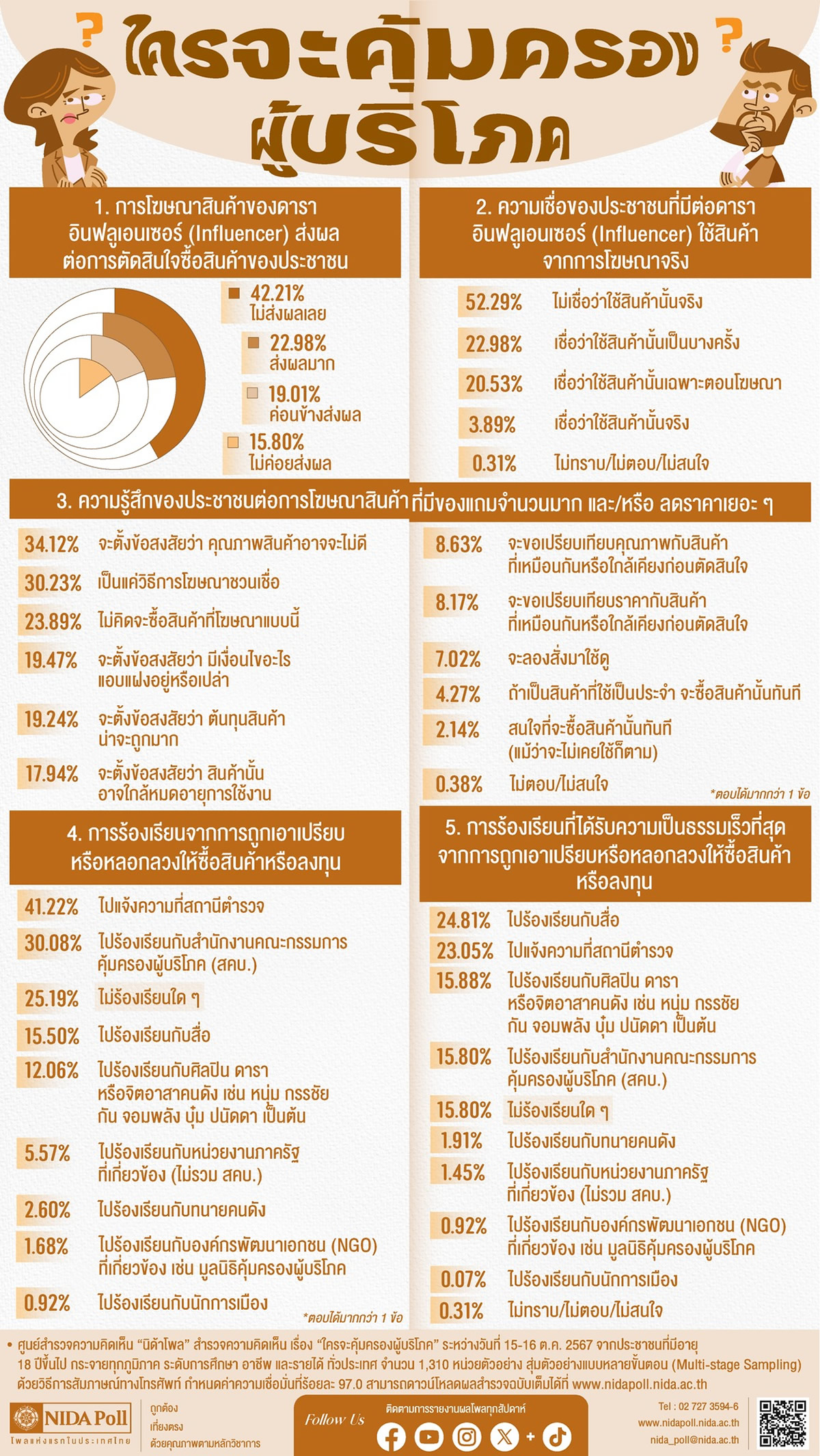 タイ国立開発行政研究院(NIDA; National Institute of Development Administration)の調査センター(NIDA Poll)は2024年10月21日、「消費者を守るのは誰ですか?」 とのテーマについての世論調査の結果を発表しました。調査は10月15日から16日にかけて、全国の18歳以上の1,310人を対象に実施しました。