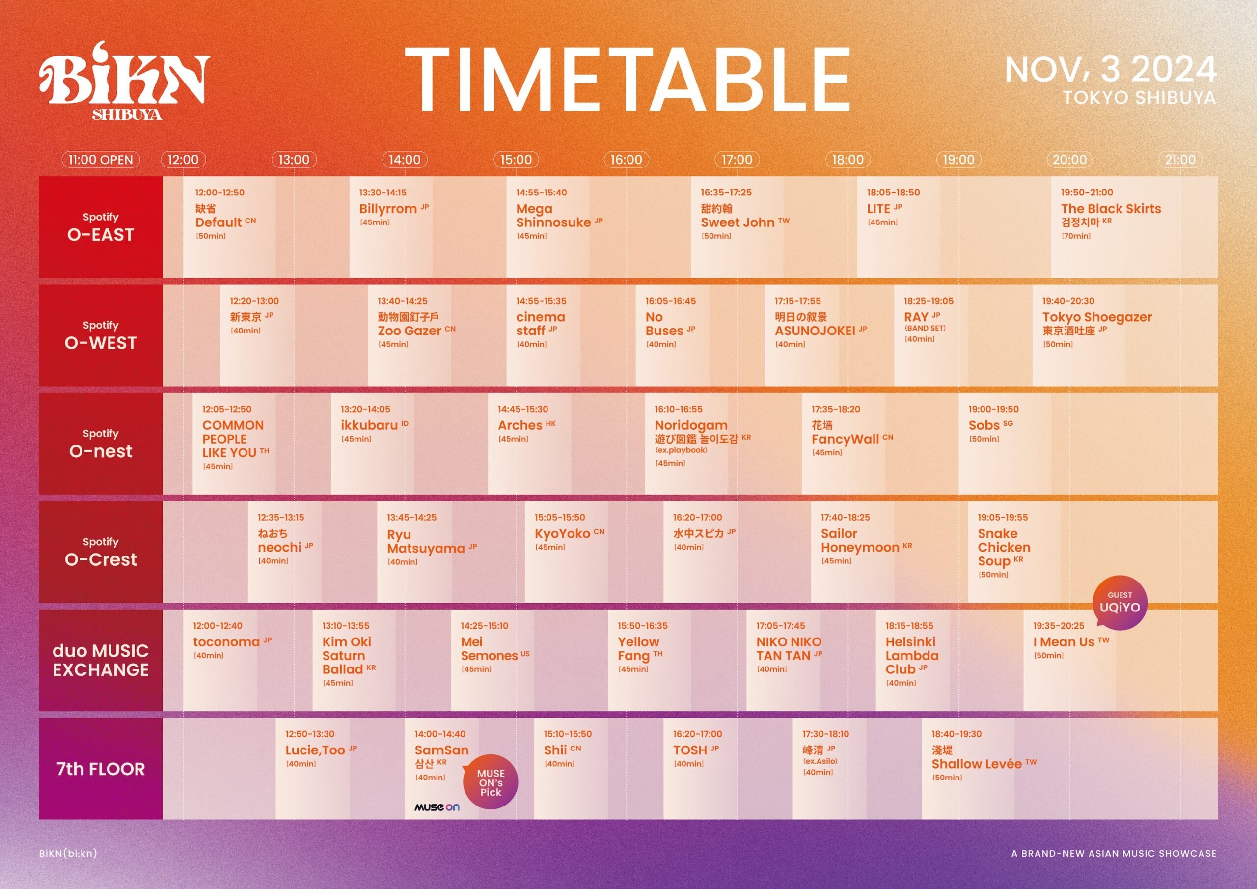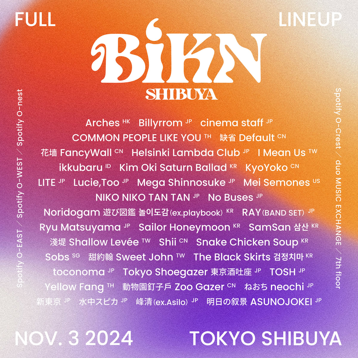 <アジアで注目を集めるアーティストが一堂に介する>という過去に例を見ないコンセプトのもと、初開催ながらアジア各国のヘッドライナー級のアーティストが参加し大きなインパクトを残したBiKN shibuyaが今年も2024年11月3日(日)に開催される。最終アーティストとしてRAY(BAND SET)(JP) / Arches (HK)/ ねおち neochi(JP)/ Ryu Matsuyama(JP) / TOSH(JP) / Lucie,Too(JP)/ SamSan(KR) / Sailor Honeymoon(KR) / Shii(CN)の9組を発表。I Mean UsのスペシャルゲストとしてUQiYOの参加も発表されている。今回の発表で全38組が公開され、あわせて当日のタイムテーブルが公開となった。