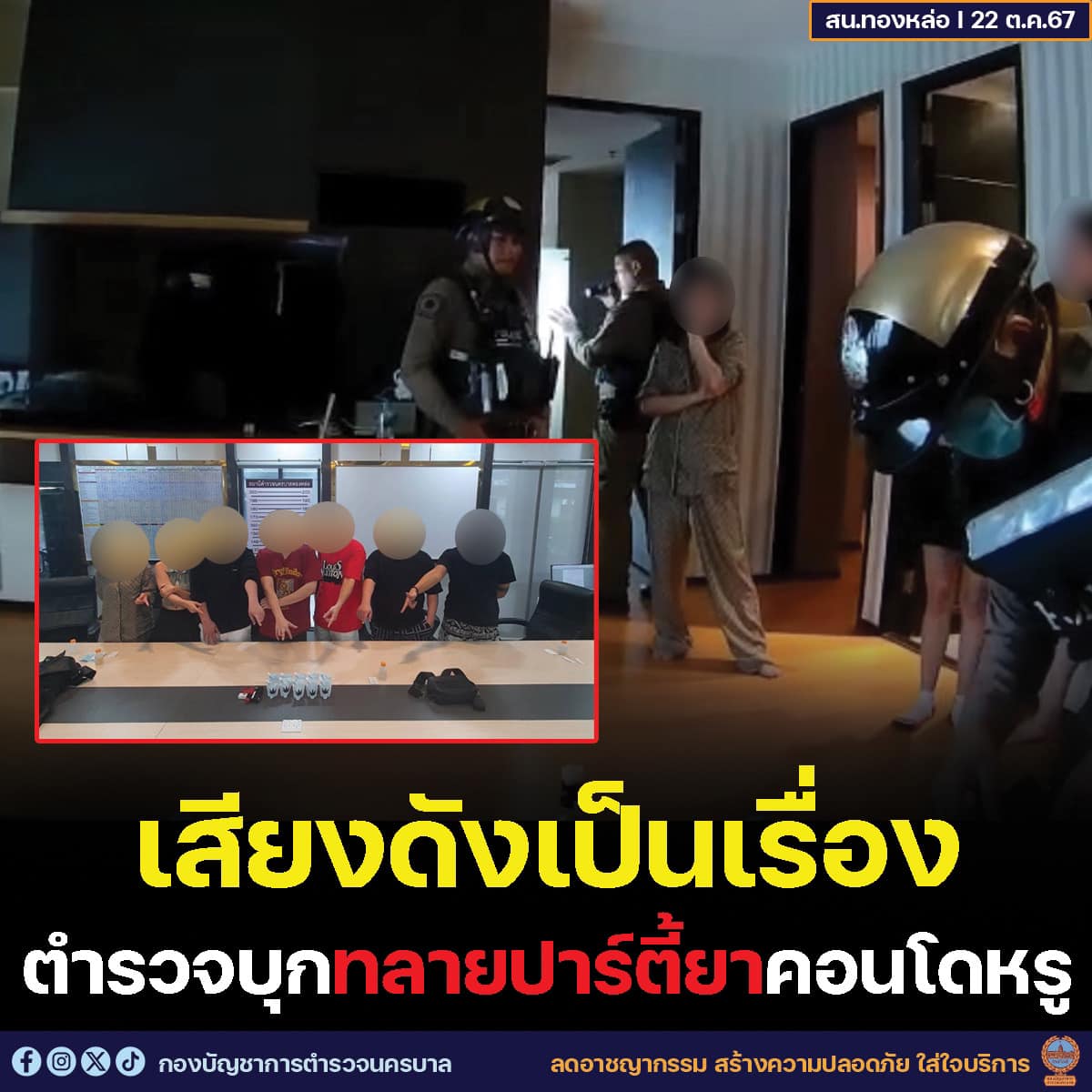 トンロー署は、コンドミニアムの部屋から大音量の音楽が流れているとの通報を受け、警察官が現場に急行。問題の部屋では、複数の人物が集まり、前夜23時頃から大音量で音楽を流しており、頻繁に外部から配達物を受け取っていたことから、薬物の乱用の疑いが浮上しました。警察官が建物の担当者と共に確認を求めた際、部屋内の人物たちは音を止めましたが、ドアを開けようとしませんでした。その後、警察官が身分を明かしてドアを開けるよう要求したところ、ようやく中に入ることができました。