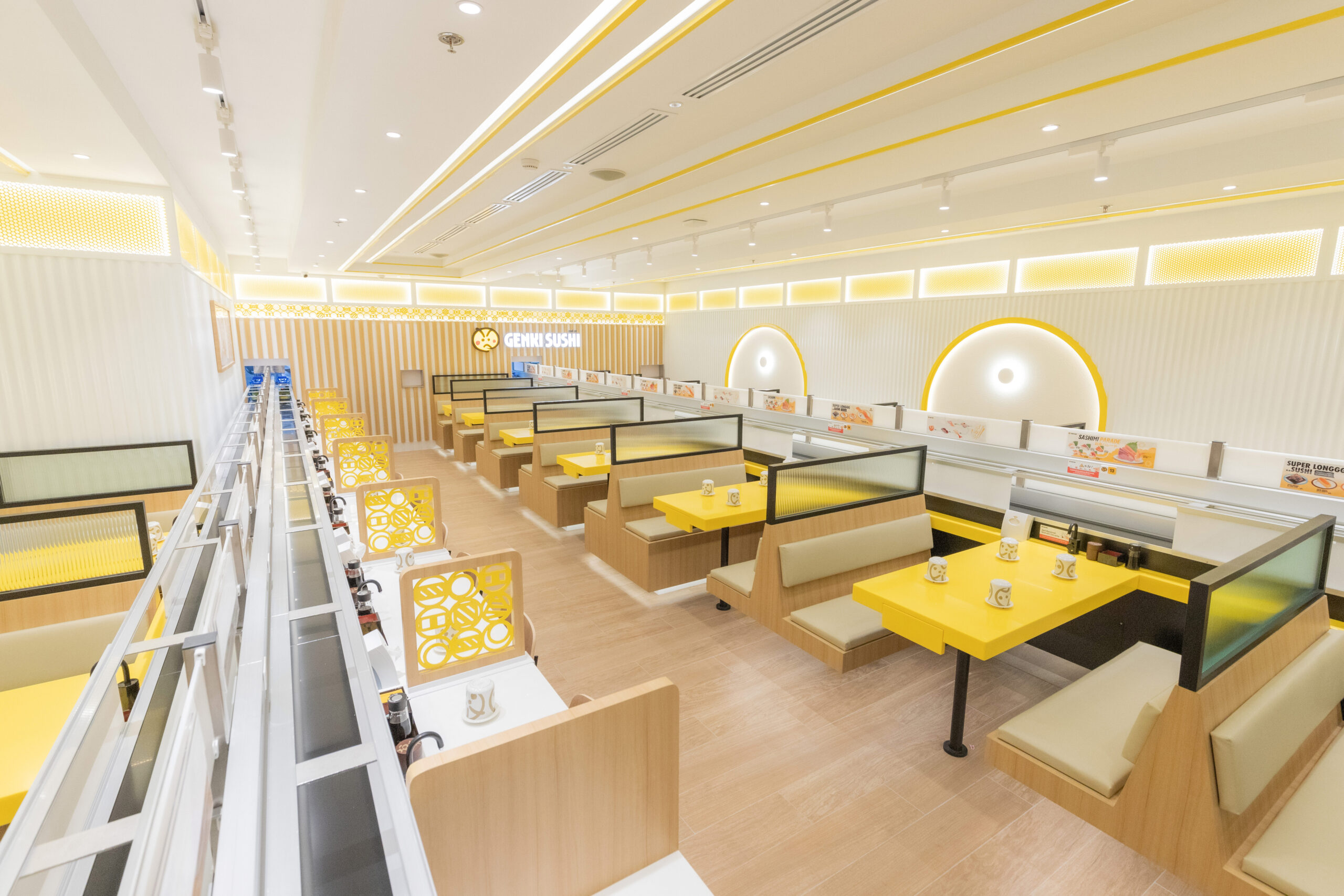 新店舗は、バンコク中心部に位置する大型ショッピングモール「Central World」の5階に位置し、観光スポットのエラワンの祠も徒歩圏内にあるため、地元の住民だけでなく観光客の来店も期待されています。店舗のデザインには「世界中を“元気”に」という同社の理念が反映され、カジュアルで親しみやすい雰囲気に仕上がっています。明るい黄色を基調とした内装は、Genki Sushiのブランドカラーを象徴しており、幅広い客層に心地よい空間を提供します。