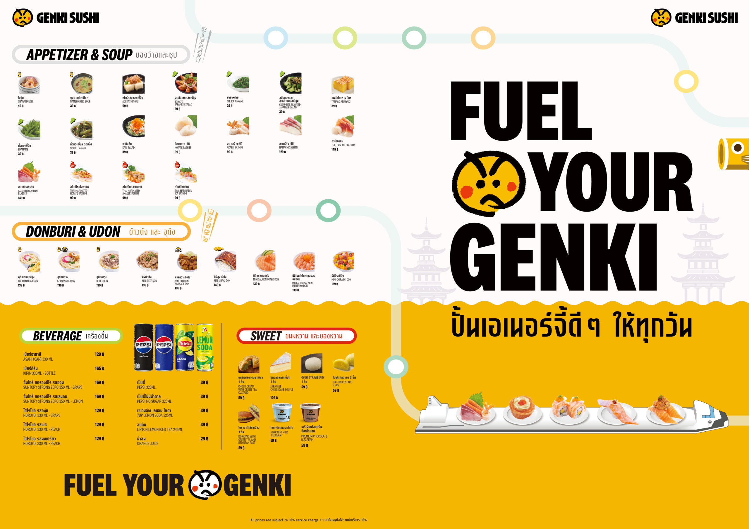 Genki Sushi Central World Storeでは、現地の味覚に合わせたメニューを取り揃えました。特に、タイで人気の高いサーモンを使用した「タイ マリネーテッド フレッシュ サーモン寿司」は、玉ねぎとパクチーを添えた一品で、タイならではのスパイシーなオリジナルソース「THAI MARINATED SAUCE」が味のアクセントになっています。また、サーモンやマグロ、エビなどの寿司メニューに加え、ホットスナックや丼もの、うどんといったメニューも提供され、地元客にも親しみやすい構成となっています。