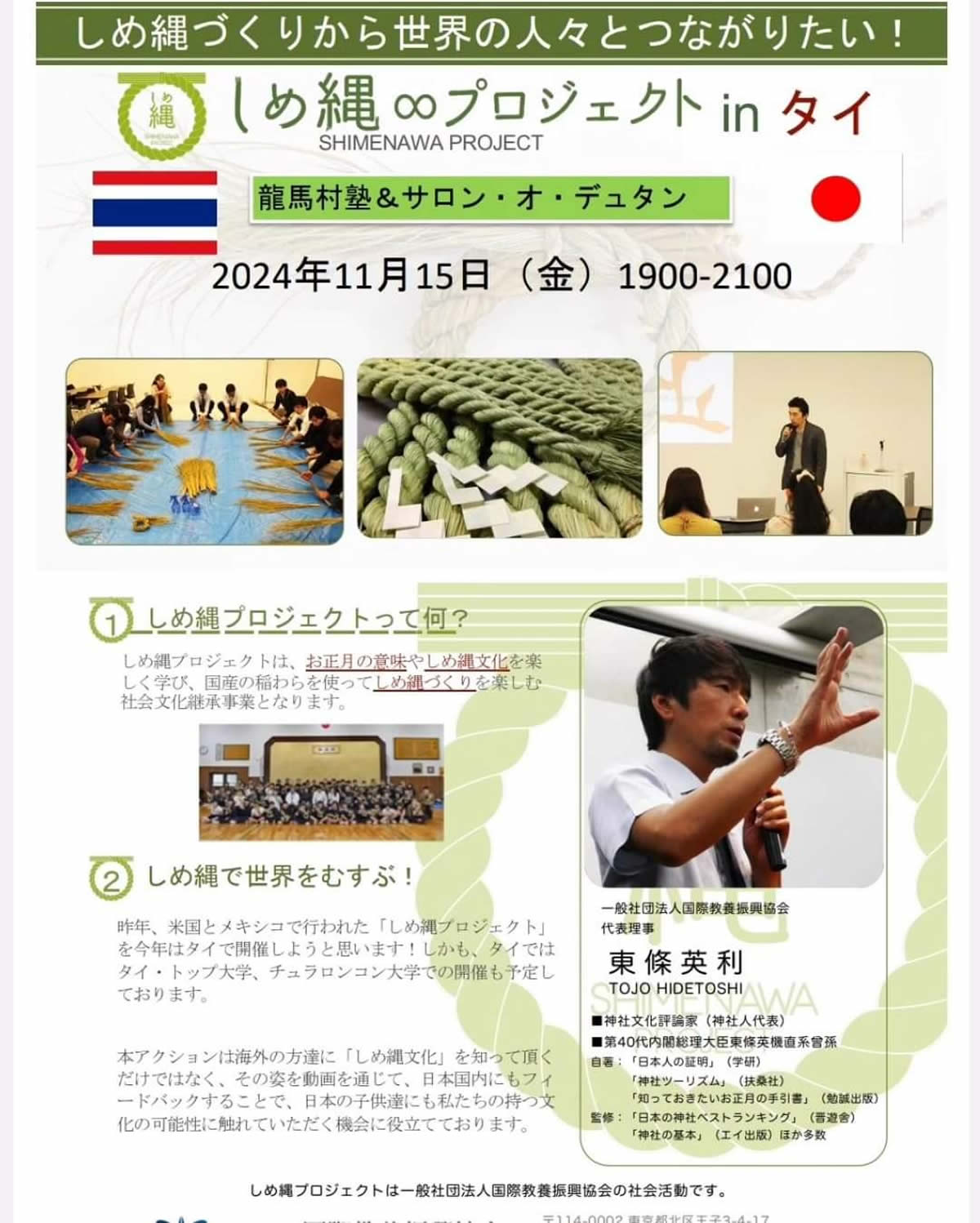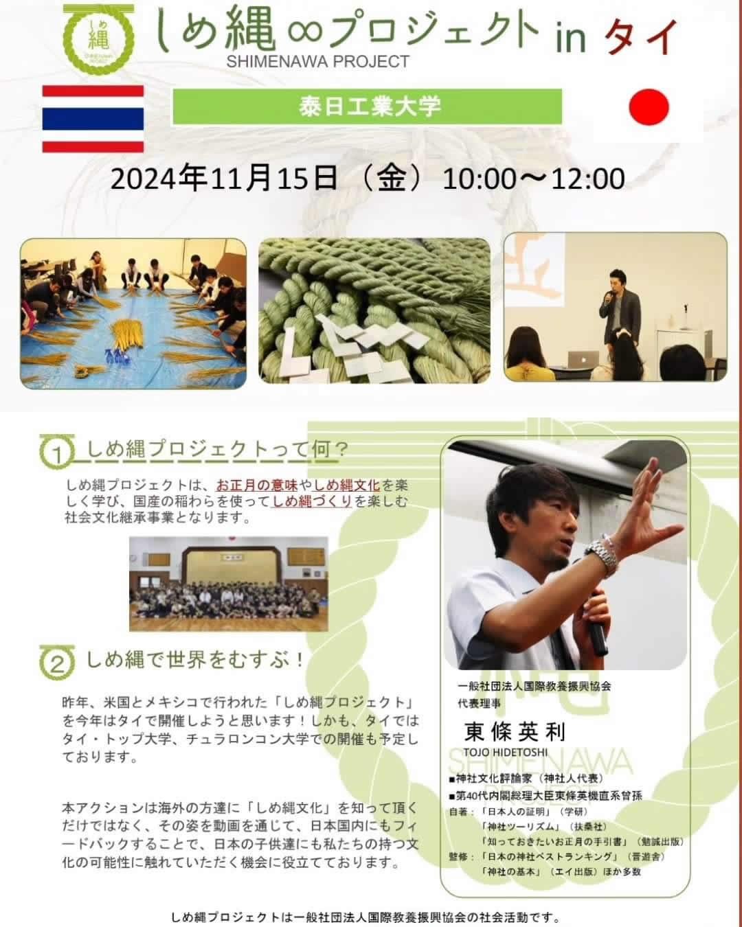 2024年11月15日(金)にバンコクの泰日工業大学とサロン・オ・デュタン(龍馬村塾)で、伝統的な日本の新年を象徴する「しめ縄」を手作りする、参加無料のワークショップが開催されます。