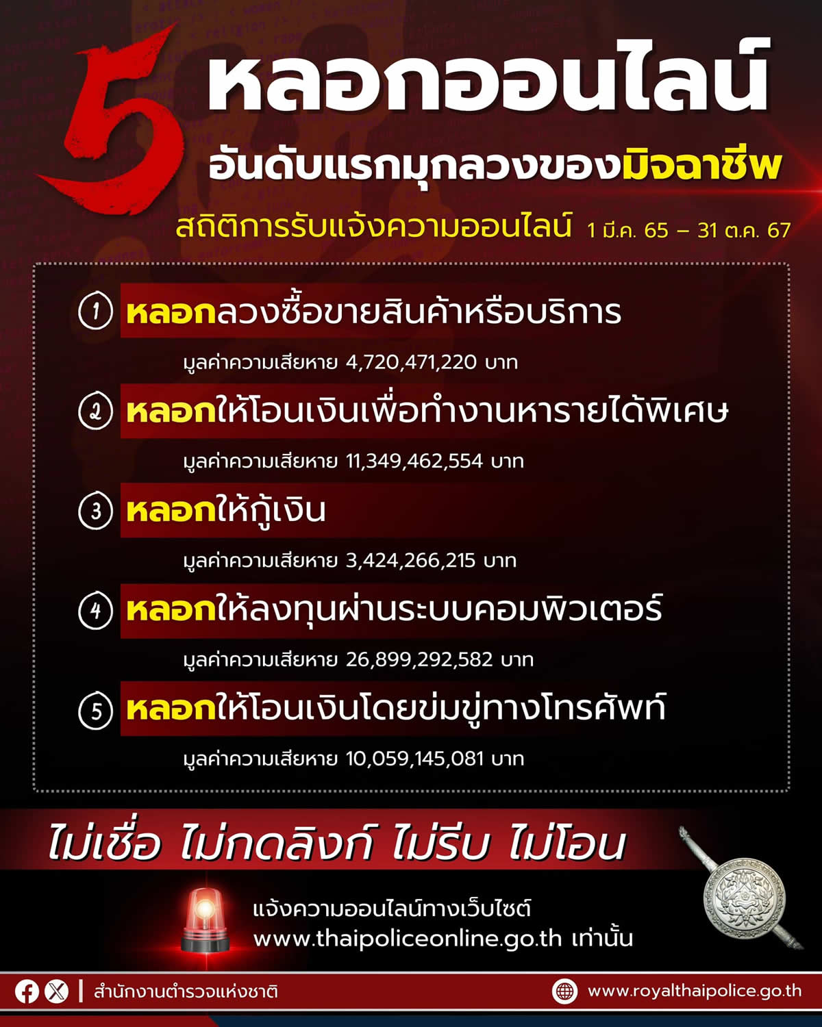 2024年11月11日、タイ警察は2022年3月1日から2024年10月31日までに報告されたオンライン詐欺事件のトップ5を発表しました。この期間中、オンライン詐欺による被害が急増しており、被害総額は甚大です。以下は報告数が多い主要なケースです。