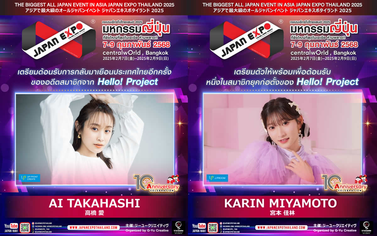 アジア最大級の日本の祭典「JAPAN EXPO THAILAND 2025(ジャパンエキスポタイランド2025)」が、バンコク・セントラルワールドで2025年2月7日(金)~9日(日)に開催。早くも出演者ラインナップの発表がスタートし、モーニング娘。元メンバーの高橋愛さんとJuice=Juice元メンバーの宮本佳林さんの出演が明らかになりました。