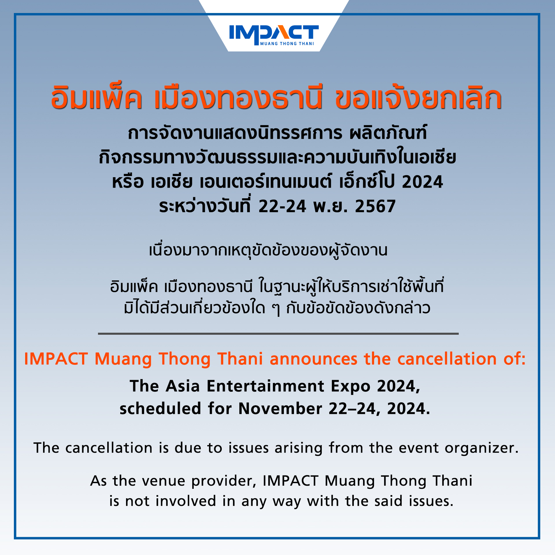 日本のトップセクシー女優が集結する「AEEアジアエンターテイメントエキスポ2024(AEE Asia Entertainment Expo 2024)」が、2024年11月22日(金)〜 2024年11月24日(日)にバンコク近郊にあるムアントンタニのインパクトフォーラム ホール 4で開催が予定されています。しかし11月19日、会場のIMPACT Arena, Exhibition and Convention Centerが突然イベントの開催中止を発表しました。