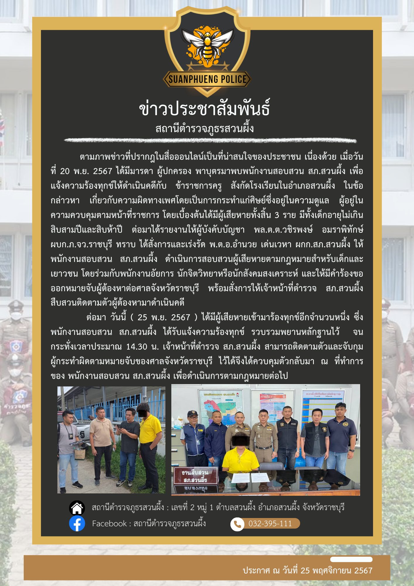 2024年11月25日、ラチャブリ県スワンプン郡の学校に通う複数の生徒の保護者が警察に通報。子どもたちが教師による性的虐待を受けていたと訴えました。捜査の結果、これまでに10人以上の生徒が被害を受けた可能性が明らかになり、同校の男性教師(30歳)が逮捕されました。