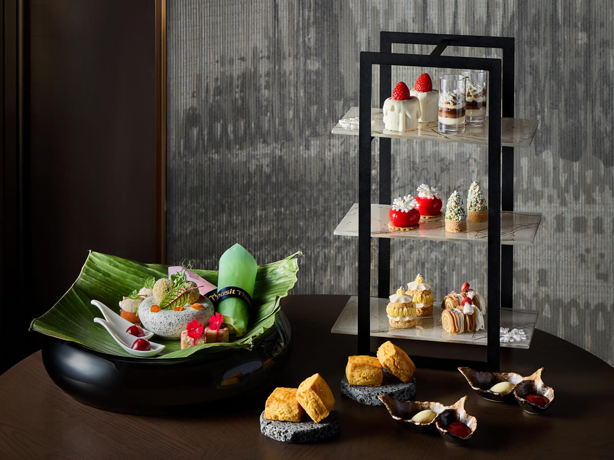 ロビーラウンジ「The Gallery」では、「タイのスパイス香る、クリスマスアフタヌーンティー」をご用意いたします。シナモン、カルダモン、クミン、タイ生姜、レモングラスといった、タイの風味豊かなスパイスが、冬の旬の食材を引き立て、味わいに深みを与えています。クリスマスキャンドルや雪の結晶、ブッシュ・ド・ノエルなど、クリスマスの心躍る情景を表現した、目にも楽しく、エキゾチックで優美な冬のアフタヌーンティーです。クリスマスには欠かせないスパイスを、デュシタニ京都ならではの形で表現し、心も身体も温まる冬のひとときをお楽しみください。
