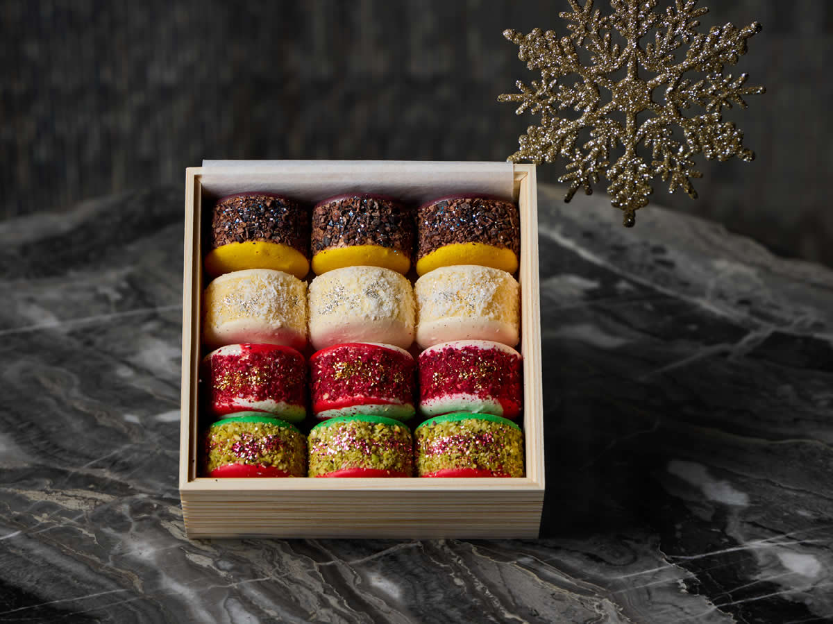 鮮やかなクリスマスカラーと愛らしいフォルムで、クリスマスのわくわく感を盛り上げるスイーツ。フレーバーは、ガートココアチョコレート(タイ・バンコクのチョコレートブランド)、ココナッツ、ラズベリー、ピスタチオの全4種類。