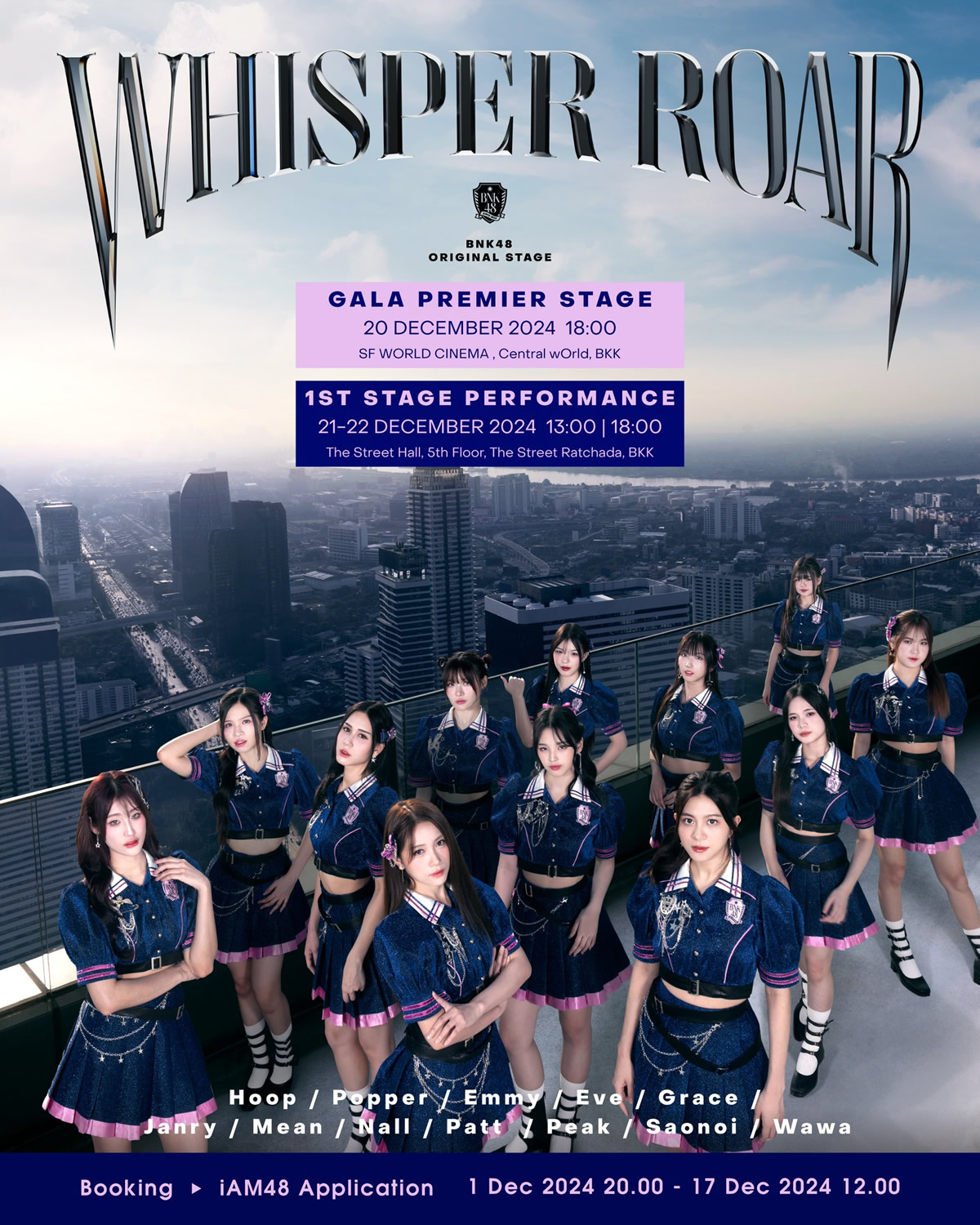 今回のステージ初披露「BNK48 Original Stage: WHISPER ROAR」は、2024年12月20日(金)にCentralWorldのSFワールドシネマで開催されます。レッドカーペットイベントやパフォーマンスが予定されており、チャープラン・アリークンを筆頭に、楽曲制作チーム、プロの振付師、そしてBNK48主要メンバー12名が参加します。そのメンバーは以下の通りです。