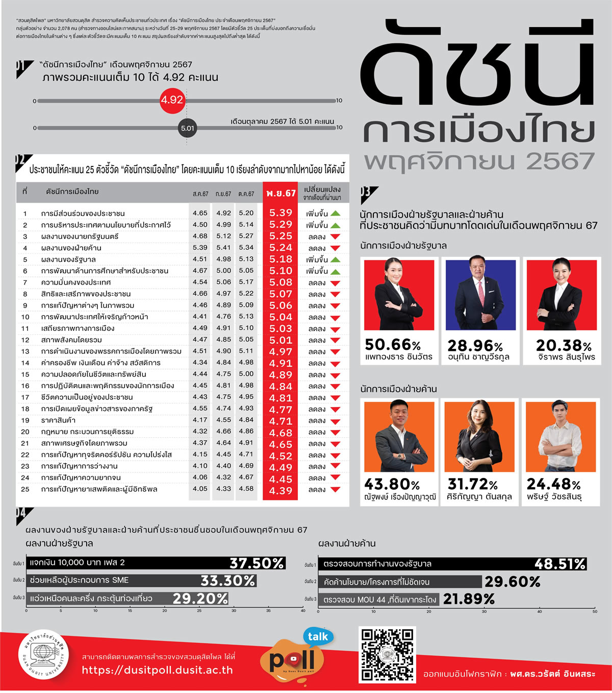 สวนดุสิตโพล สำรวจความคิดเห็นประชาชน เรื่อง “ดัชนีการเมืองไทย ประจำเดือนพฤศจิกายน 2567” สำรวจทางออนไลน์และภาคสนาม พบกลุ่มตัวอย่างให้คะแนนภาพรวม เฉลี่ย 4.92 คะแนน ลดลงจากเดือน ต.ค. 2567 ที่ได้ 5.01 คะแนน (คะแนนเต็ม 10 คะแนน)