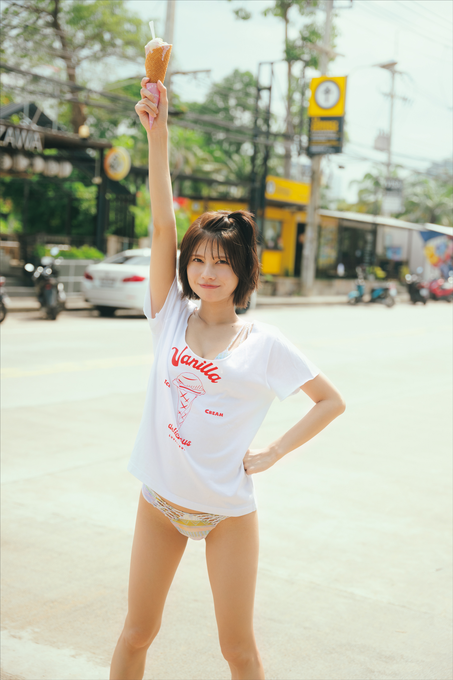 アイスクリームを掲げたキュートな1枚。まさに「デートなう」な、彼女感あふれるカットも多数収録。(撮影:カノウリョウマ)