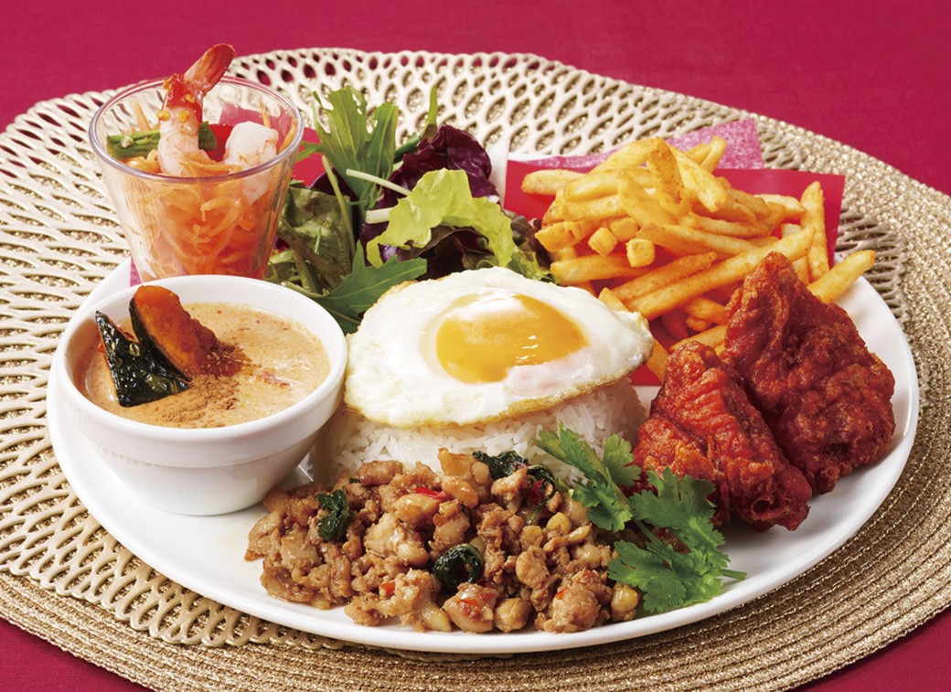 タイ料理レストラン「マンゴツリーカフェ」で、今しか食べられない一皿「マンゴツリーカフェの冬プレート」を2024年12月4日(水)より期間限定で販売開始。タイ料理といえば思い浮かべるガパオライス・カレーをはじめ、見た目は赤いのに辛くないカレー風味のレッドチキン・海老とニンジンのソムタムソースがけ・トムヤムポテト・グリーンサラダを、少しずつ一度に味わうことができます。