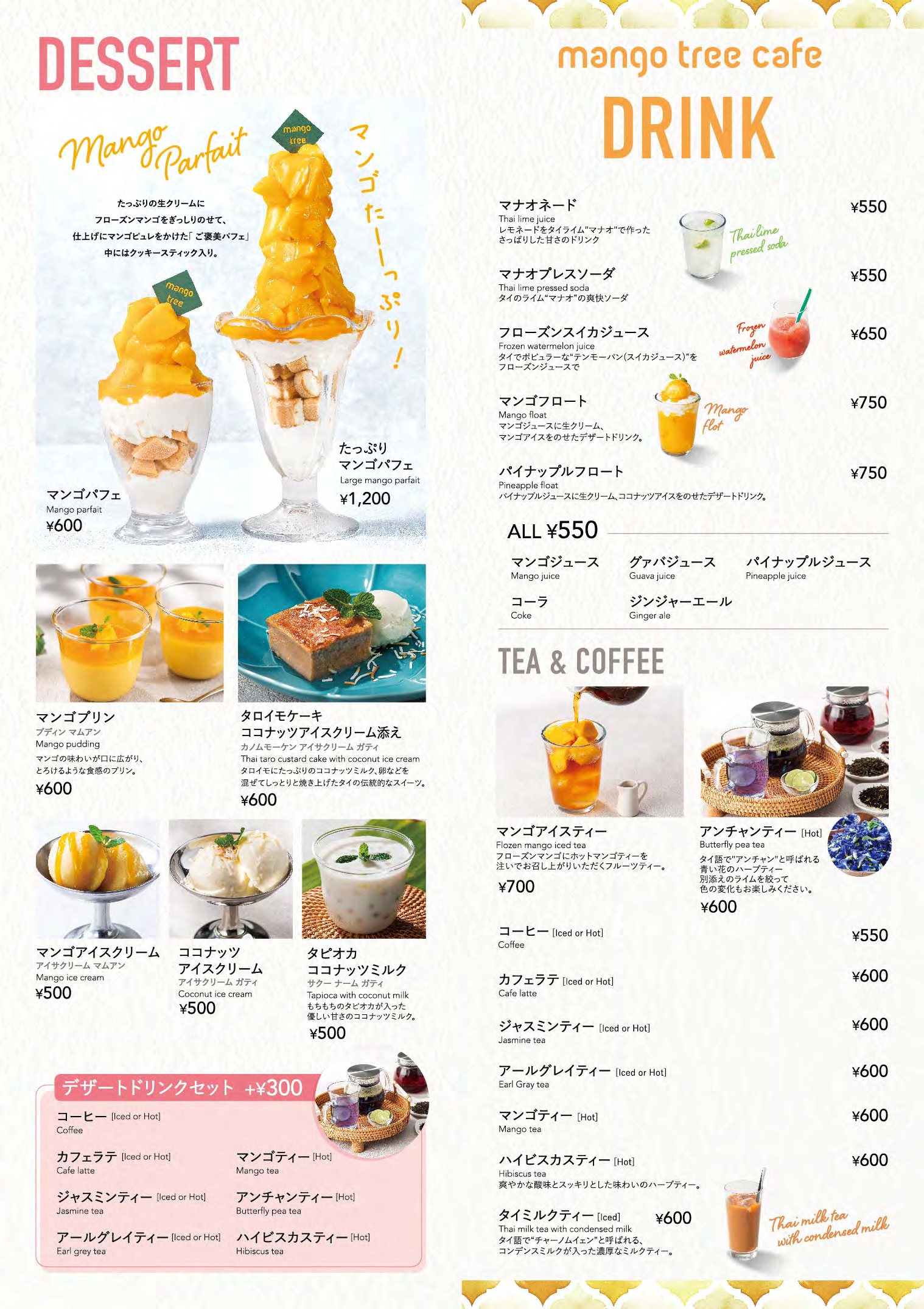 姉妹店として、タイ伝統の味をカジュアルにご提供するカフェレストラン「マンゴツリーカフェ」(新宿・恵比寿・東京ドームシティラクーア・豊洲・北千住・横浜・川崎・大宮・浦和芝原・大阪・EXPOCITY)、ご家庭でもタイの伝統料理をお楽しみいただけるテイクアウト専門店「マンゴツリーデリ」(伊勢丹新宿本店)、テイクアウトにイートインスペースをプラスした「マンゴツリーキッチン」(グランスタ丸の内・横浜ジョイナス・エキュート大宮(カオマンガイキッチン)・グランフロント大阪)、フードコート「マンゴツリーキッチンららぽーと横浜」と、「mango tree」の世界は広がり続けています。