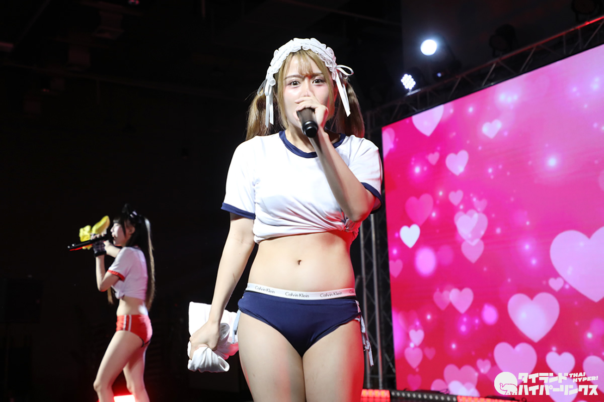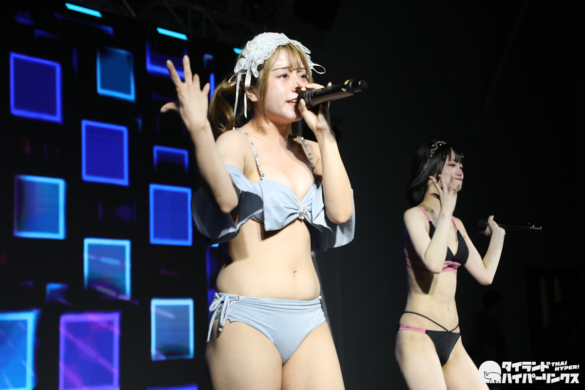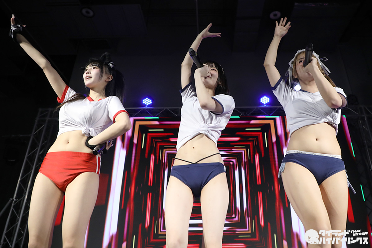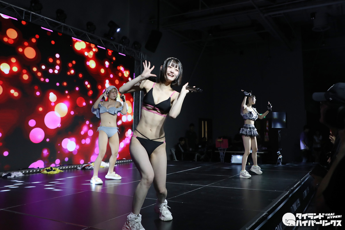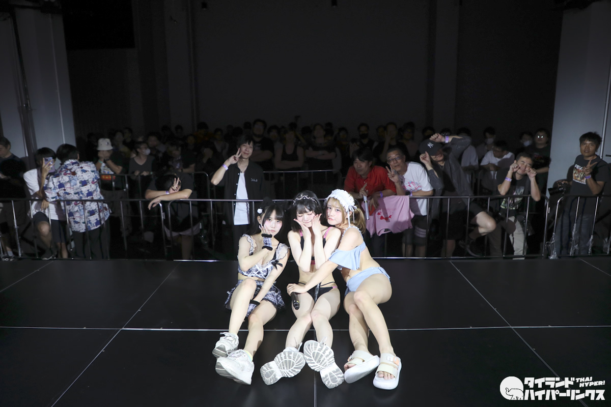 わたあめふわり、れなあざらし、にゃーすの3人が参加した9時間1500円の初タイ遠征。前日に続いてのドンキホール登場となった「Bloomers Party」では、“過激”だと聞いていた通り、ライブにはブルマで登場し、途中ステージ上で水着に着替え、そのままパフォーマンスを続行。スマホのカメラを構えたオタクたちの熱狂の中、25分間のステージが終了しました。