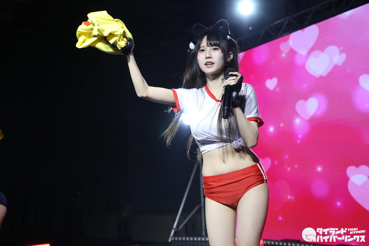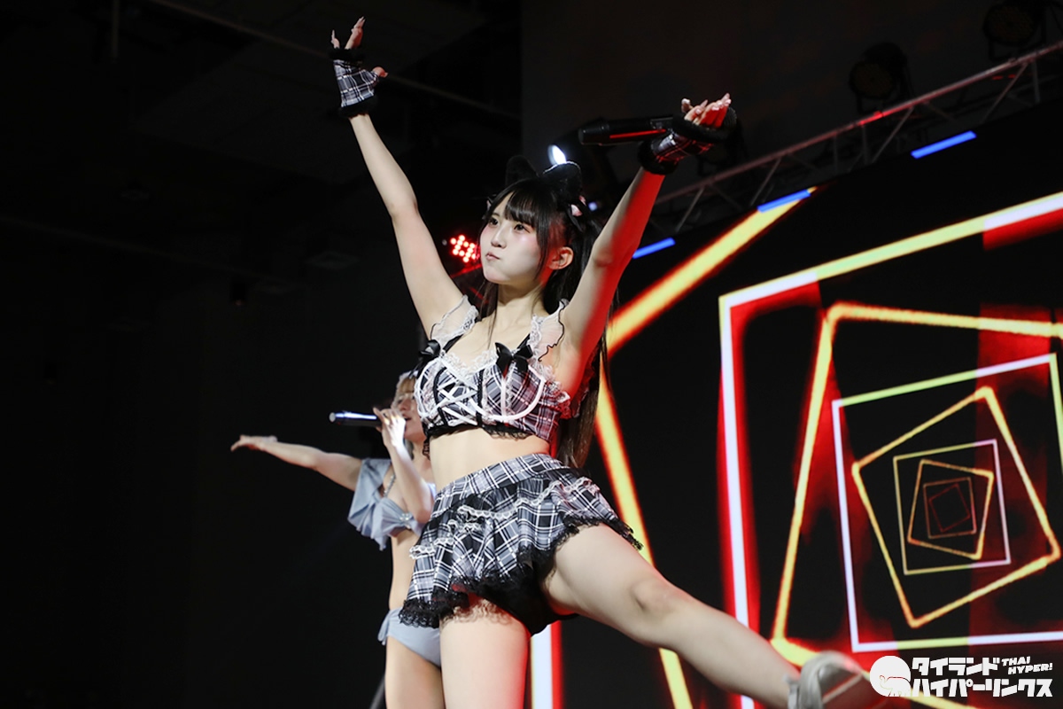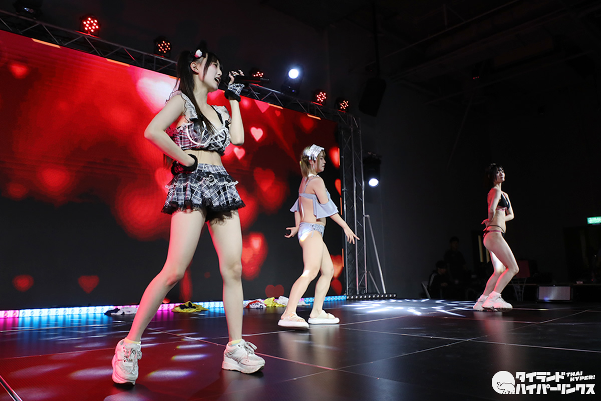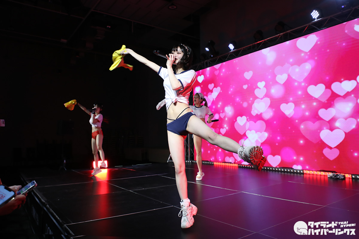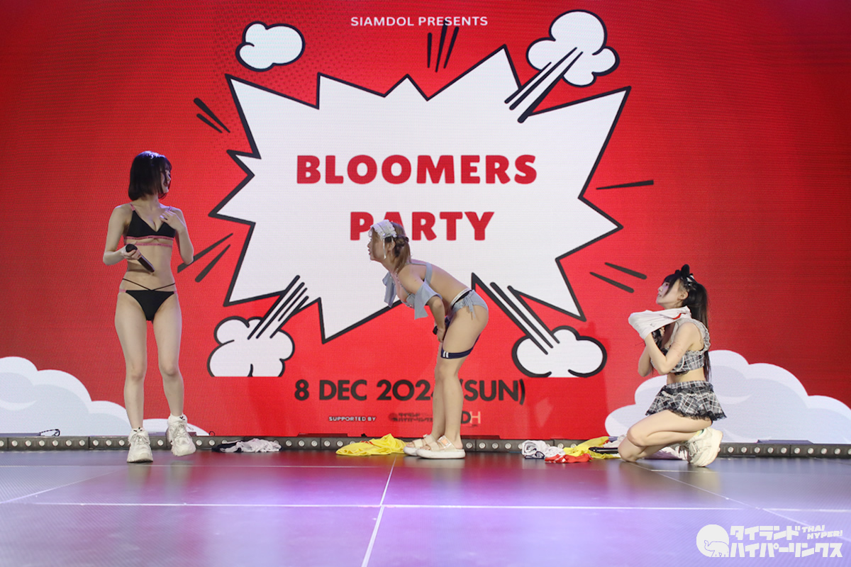 わたあめふわり、れなあざらし、にゃーすの3人が参加した9時間1500円の初タイ遠征。前日に続いてのドンキホール登場となった「Bloomers Party」では、“過激”だと聞いていた通り、ライブにはブルマで登場し、途中ステージ上で水着に着替え、そのままパフォーマンスを続行。スマホのカメラを構えたオタクたちの熱狂の中、25分間のステージが終了しました。