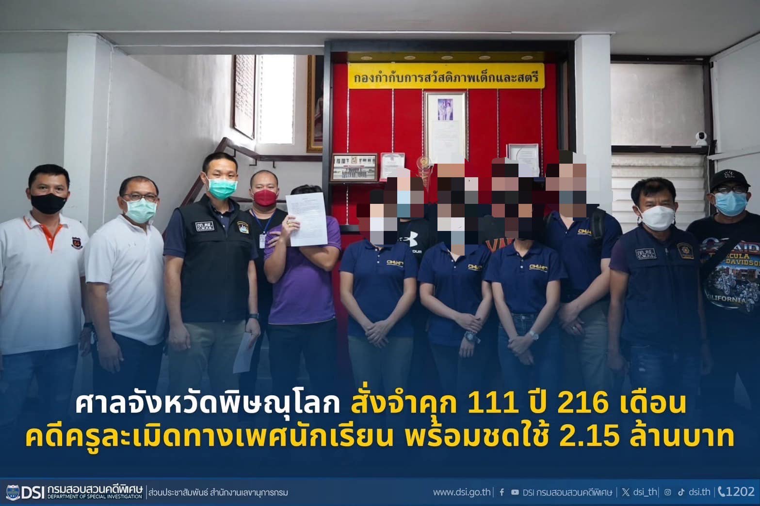 タイ法務省特別捜査局 (Department of Special Investigation:DSI)によると、タイ北部ピサヌローク県で、教師が児童に性的虐待を加えていた事件で、地方裁判所は被告の男に禁錮111年216ヶ月と215万バーツの損害賠償を命じました。