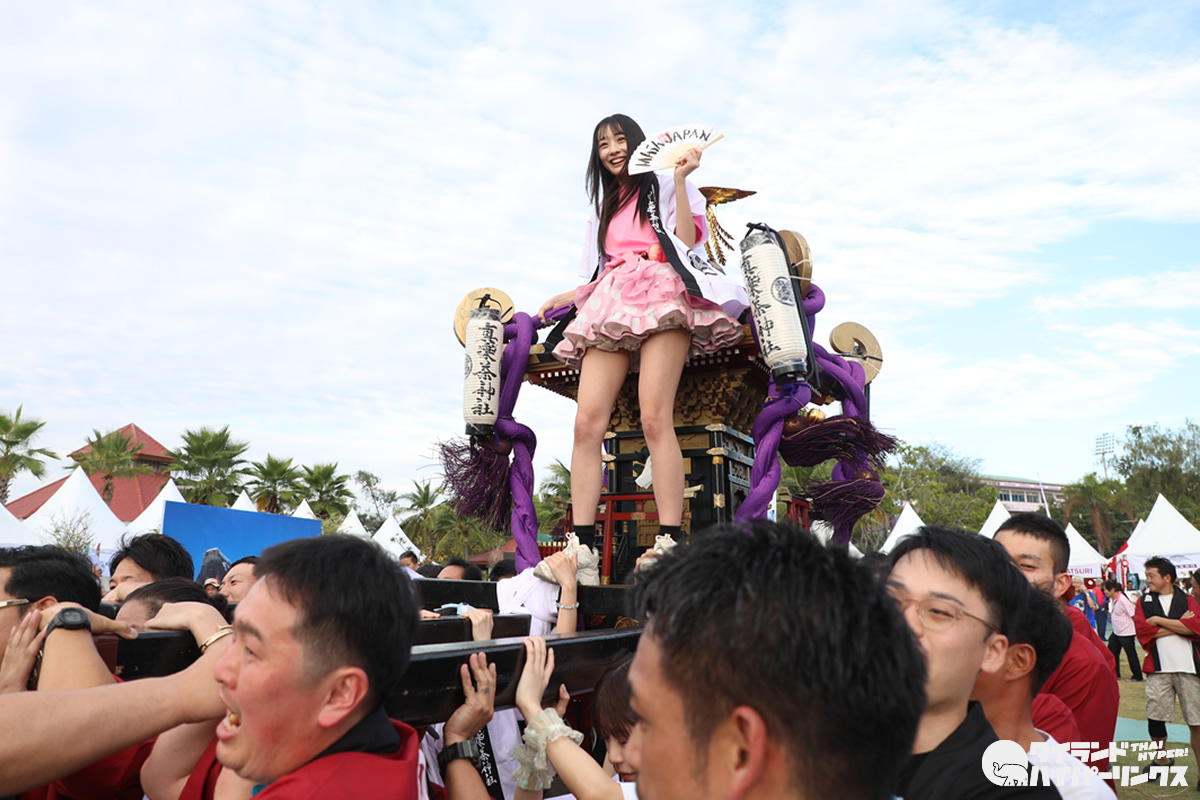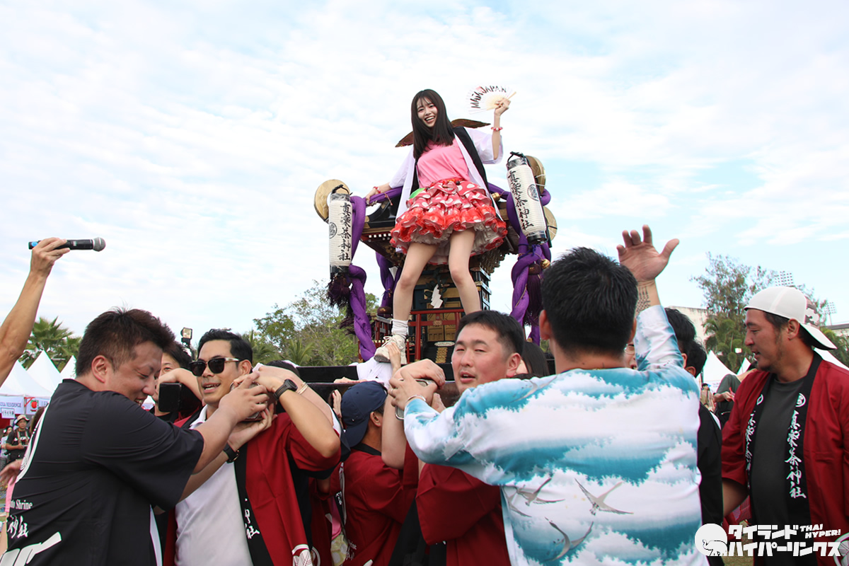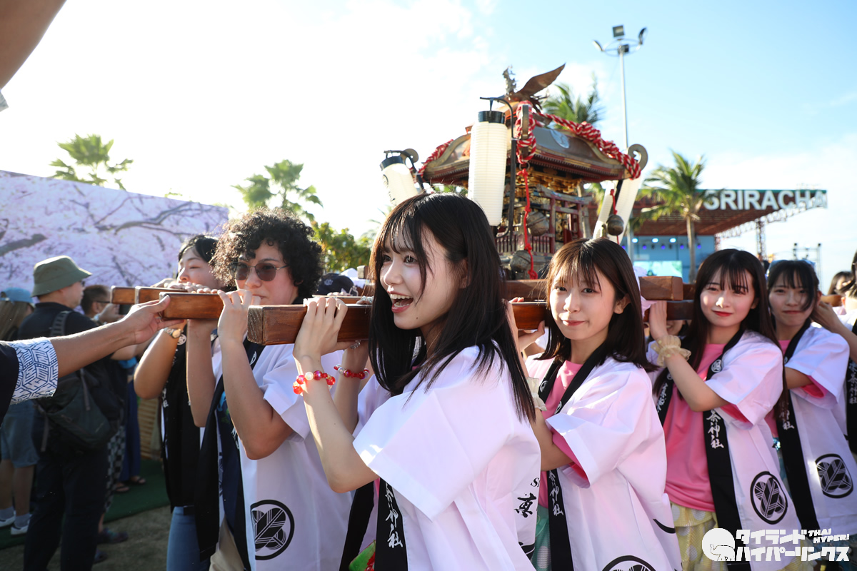 シラチャには、真楽茶神社(シラチャ神社)が建立されたことで、2023年からは本物の御神輿が「シラチャ日本祭り」登場。この日はゲストとして招かれた「香水」で知られる瑛人さん、お祭りアイドルグループ FES☆TIVE、元AKB48のメンバーで演歌歌手の岩佐美咲さん、タイのアイドル SumomoとEuphonie☆が参加しています。