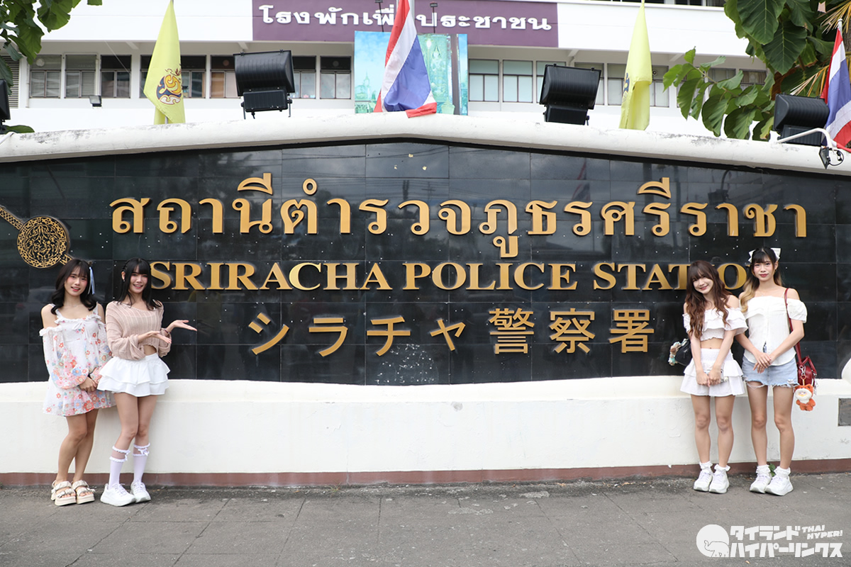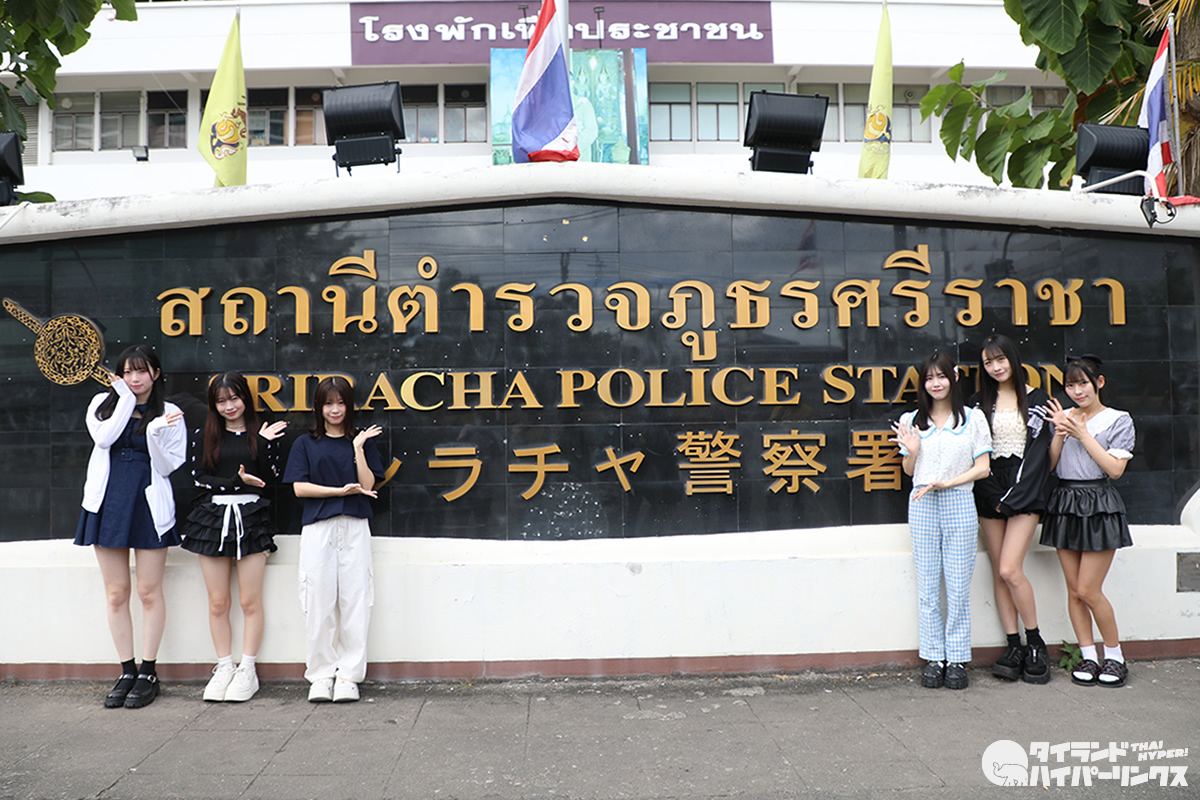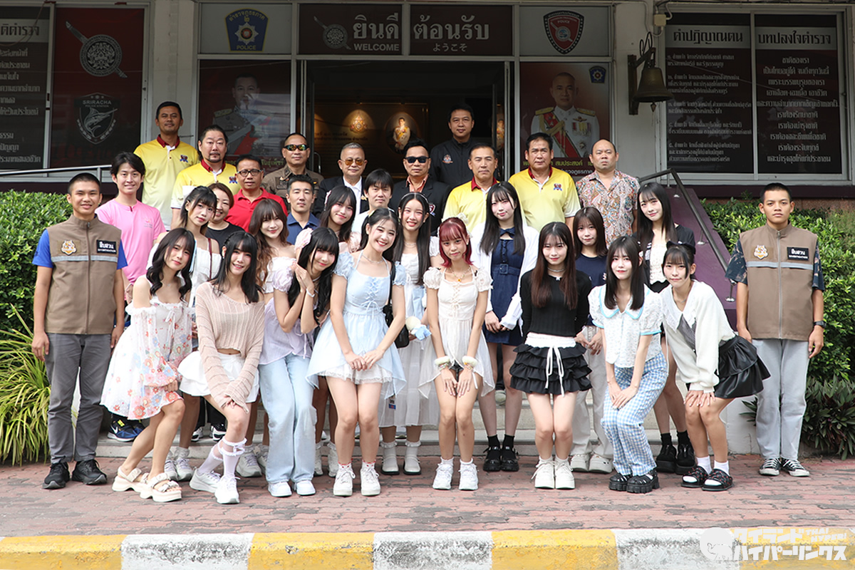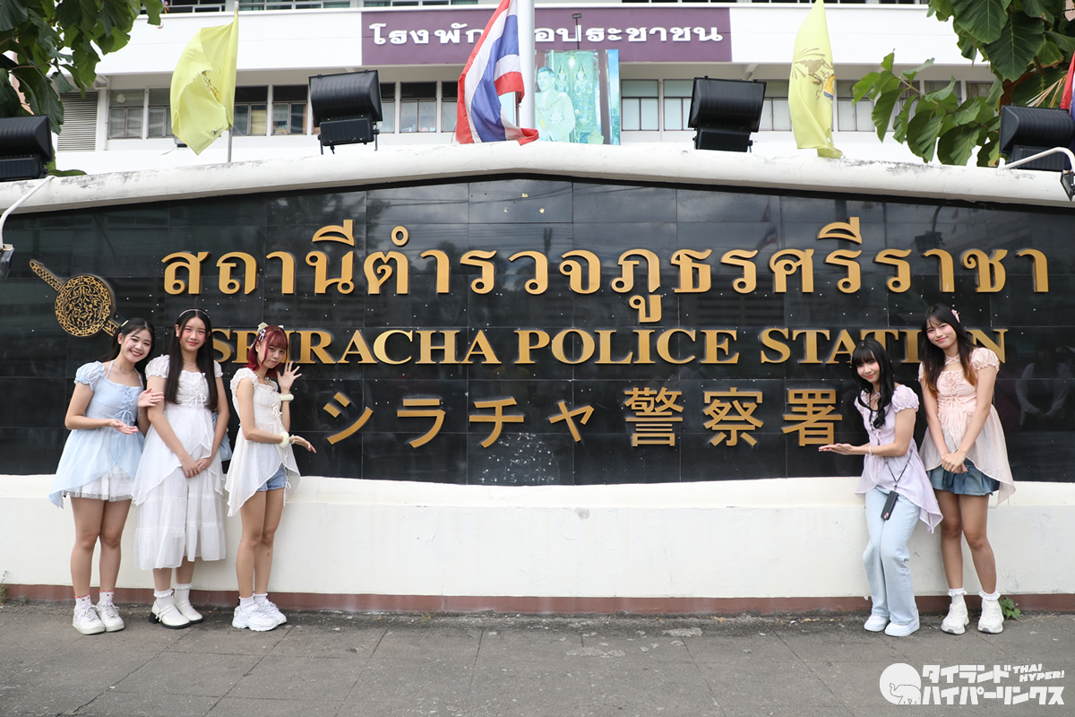 実はFES☆TIVEは、2024年12月14日(土)・15(日)に開催された「第13回 シラチャ日本祭り」に参加。お馴染みのパフォーマンスで大いに会場を盛り上げたFES☆TIVEが、同イベントに一緒に参加したタイのアイドル Sumomo、Euphonie☆と共にシラチャ署に招かれたのです! シラチャ署で日本の芸能人が撮影などを行うのは初とのことで、シラチャ署をあげての大歓迎でした。