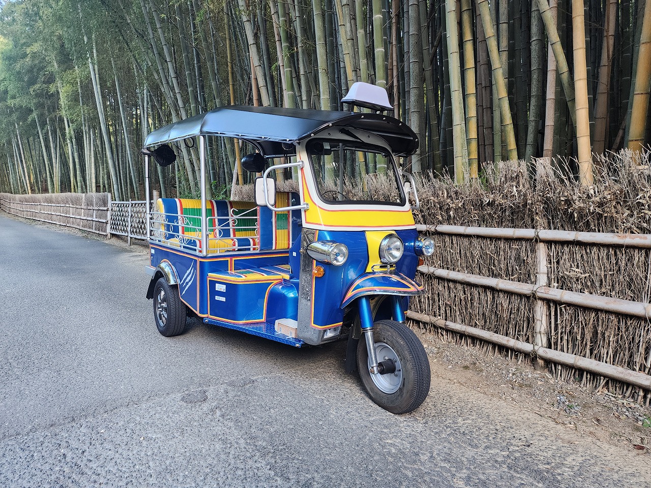 タイやベトナムなど東南アジアで馴染み深い三輪車「トゥクトゥク」をベースに、日本仕様に改良。日本車のエンジンを搭載し、オートマチック車両にコンバージョン。普通車AT免許があれば誰でも運転可能で、国際免許を持つ海外の観光客も利用可能です。