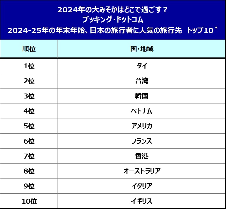 Booking.com は2024年12月20日、2024-25年の年末年始の日本の旅行者の動向を探るべく、2024年12月31日(大みそか)チェックインで検索された宿泊施設のデータ*をもとに、日本の旅行者に人気の海外旅行先をランキング形式で発表。1位はタイでした。