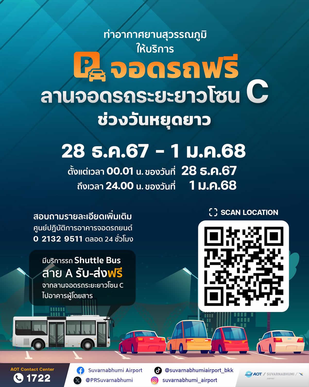 タイ運輸省の新年ギフトポリシーの一環として、スワンナプーム空港では、2024年12月28日0時1分から2025年1月1日24時までの間、長期駐車場ゾーンCで無料駐車サービスを提供します