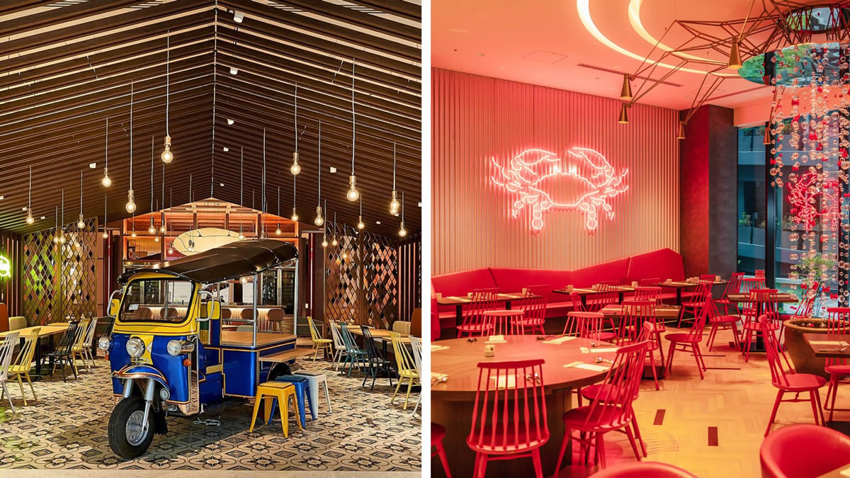 ホテル2階にあるタイ料理レストラン「スアンブア」のエントランスには、タイを象徴するトゥクトゥクが飾られ、タイの伝統的なパターン柄を現代風にアレンジしたインテリアが美しい店内には、本場さながらのスパイスの香りが漂います。隣接するシーフードレストラン「エンバシー・オブ・クラブ」は、アイコニックな蟹のモチーフや真っ赤なインテリア、シャンデリアが印象的でクラブマーケットの雰囲気を表現しています。