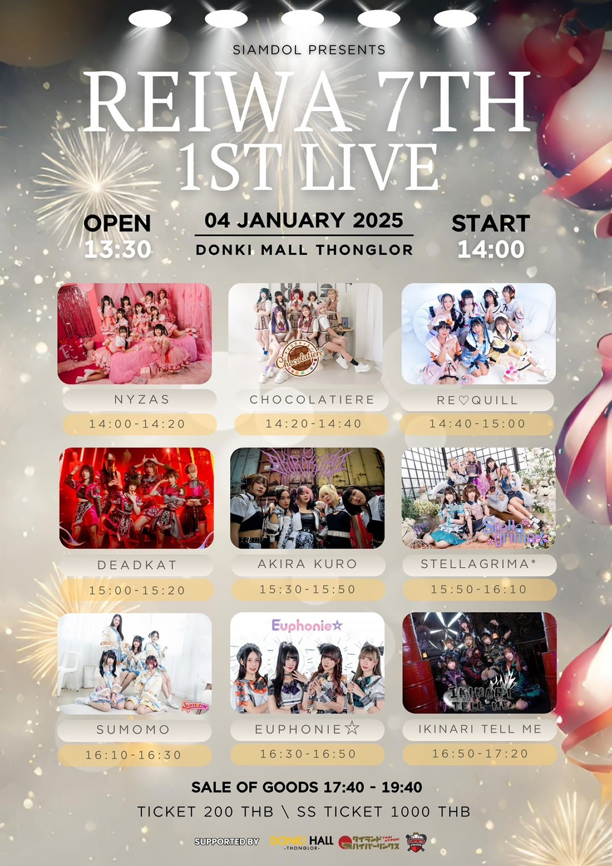 西暦2025年は、タイでは2568年、日本では令和7年。 バンコクのドンキホール(ドンキモール・トンロー4階)では1月4日(土) 、タイのアイドル9組が出演する対バンライブ「令和7年ファーストライブ(Reiwa 7th 1st Live)」が開催されます。主催はSiamdol。チケット価格は通常200バーツ、最前列は1000バーツ。こちらでの販売になります。
