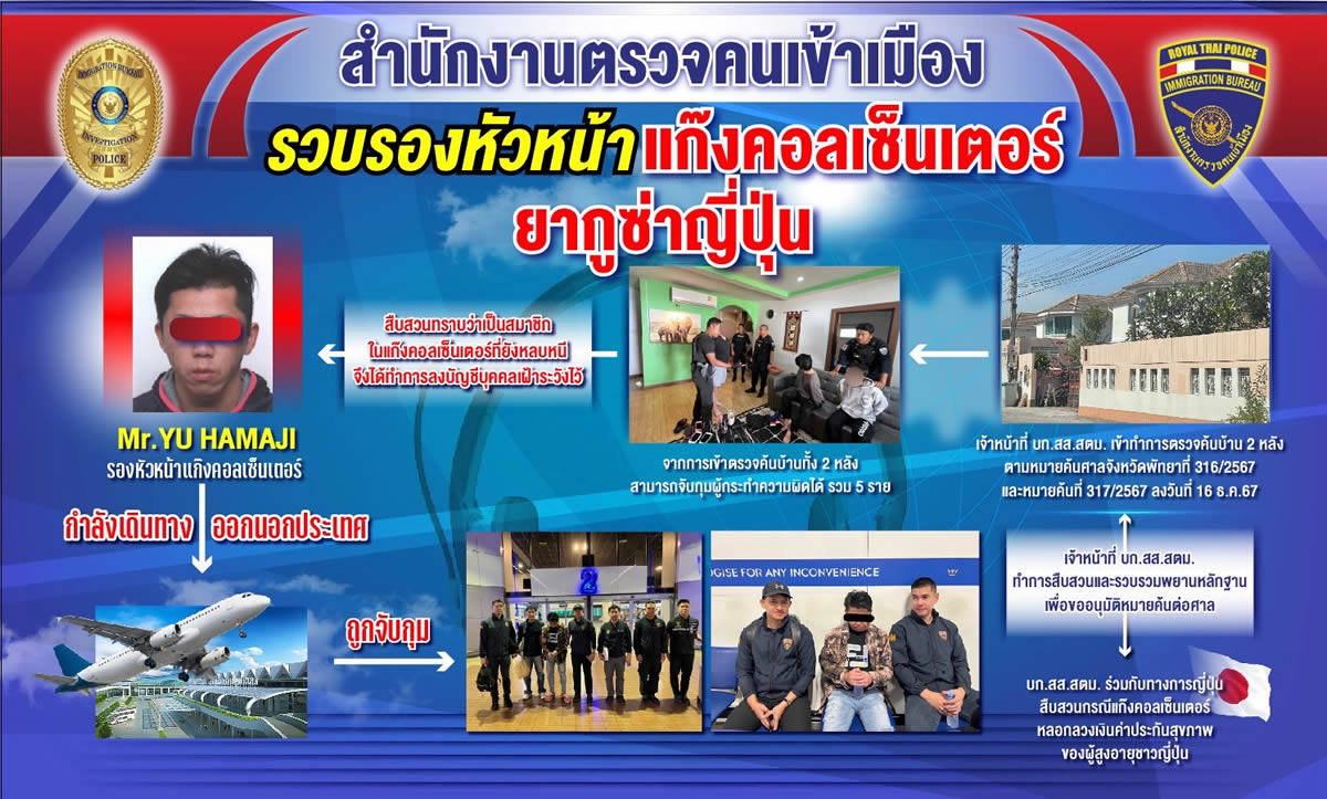 タイ入国管理局は2025年1月12日、日本人高齢者を狙った特殊詐欺団の副リーダーであるHAMAJI YU(仮名? 34歳)容疑者をバンコクの空港で拘束しました。HAMAJI容疑者は要注意人物リストに登録されており、タイを出国しようとしていたところを逮捕されました。