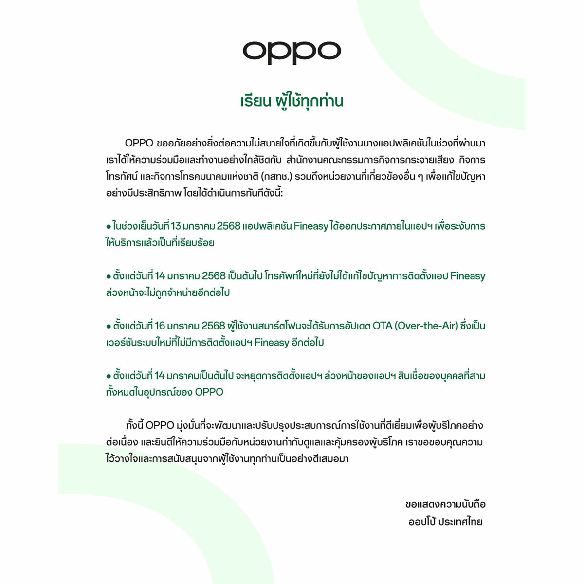 中国のスマートフォンメーカーのOPPOは2025年1月14日、事前インストールされていた問題のアプリ「Fineasy」に関する対応策を公式に発表しました。この問題は、タイの消費者協議会(สภาองค์กรของผู้บริโภค)が指摘したもので、個人情報の侵害や削除不可の仕様が問題視されていました。