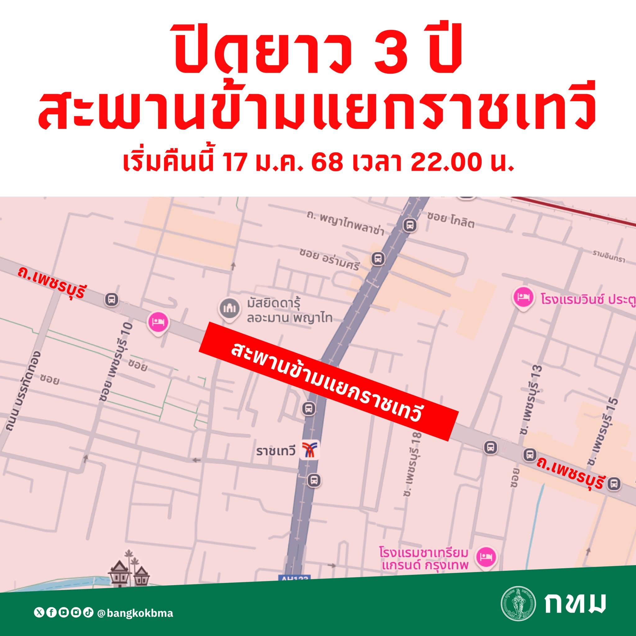 バンコク都によると、バンコク都市鉄道オレンジライン(バーン・クン・ノン~タイ文化センター区間)の工事のため、ラーチャテーウィー高架橋が2025年1月17日から2028年4月30日まで閉鎖されます。
