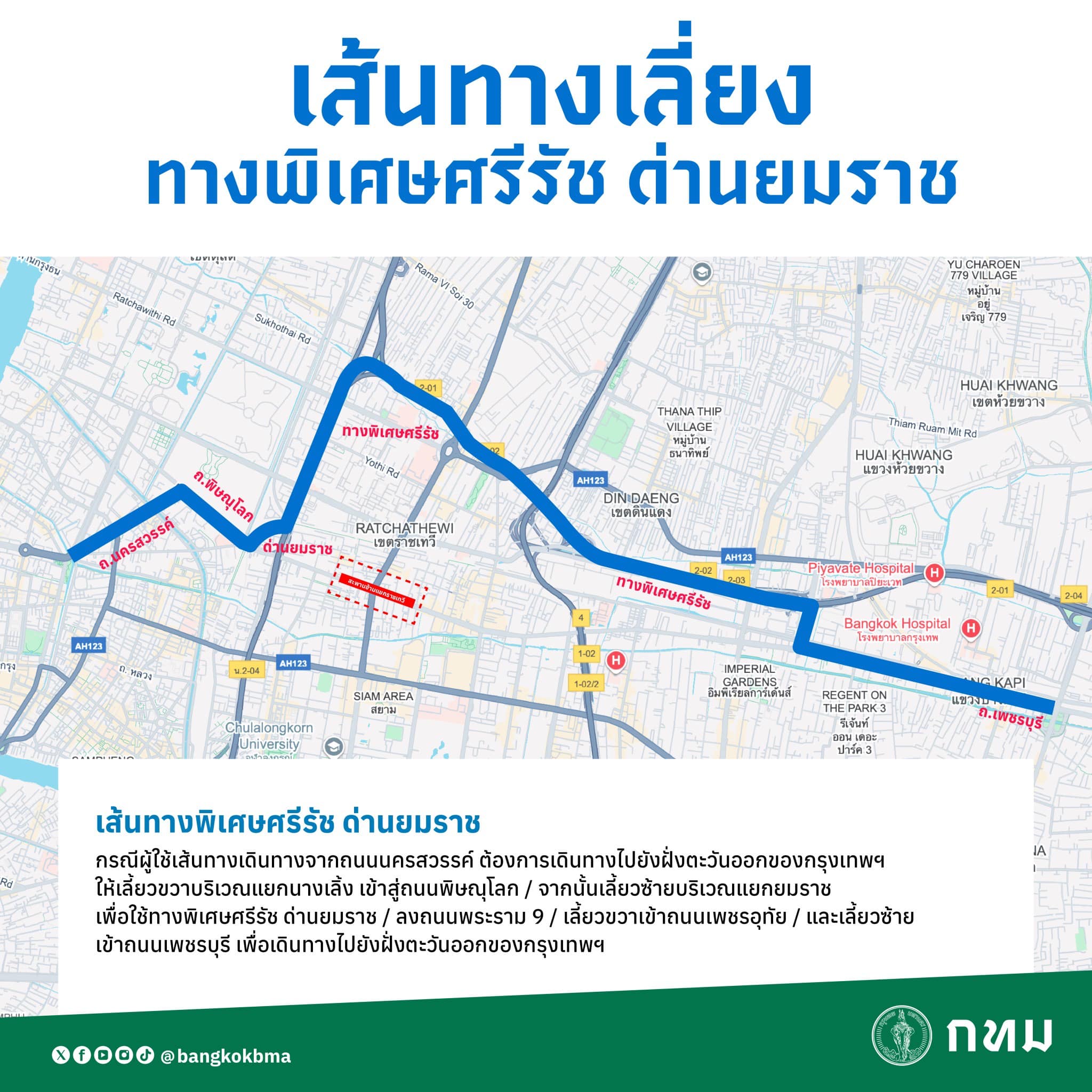 ナコンサワン通りから来る車両は、ナーンルアン交差点で右折してピッサヌローク通りに入り、ヨムマラート交差点で左折してヨムマラート料金所から高速道路に入り、ラマ9世通りで高速道路を降りるよう指示されています。