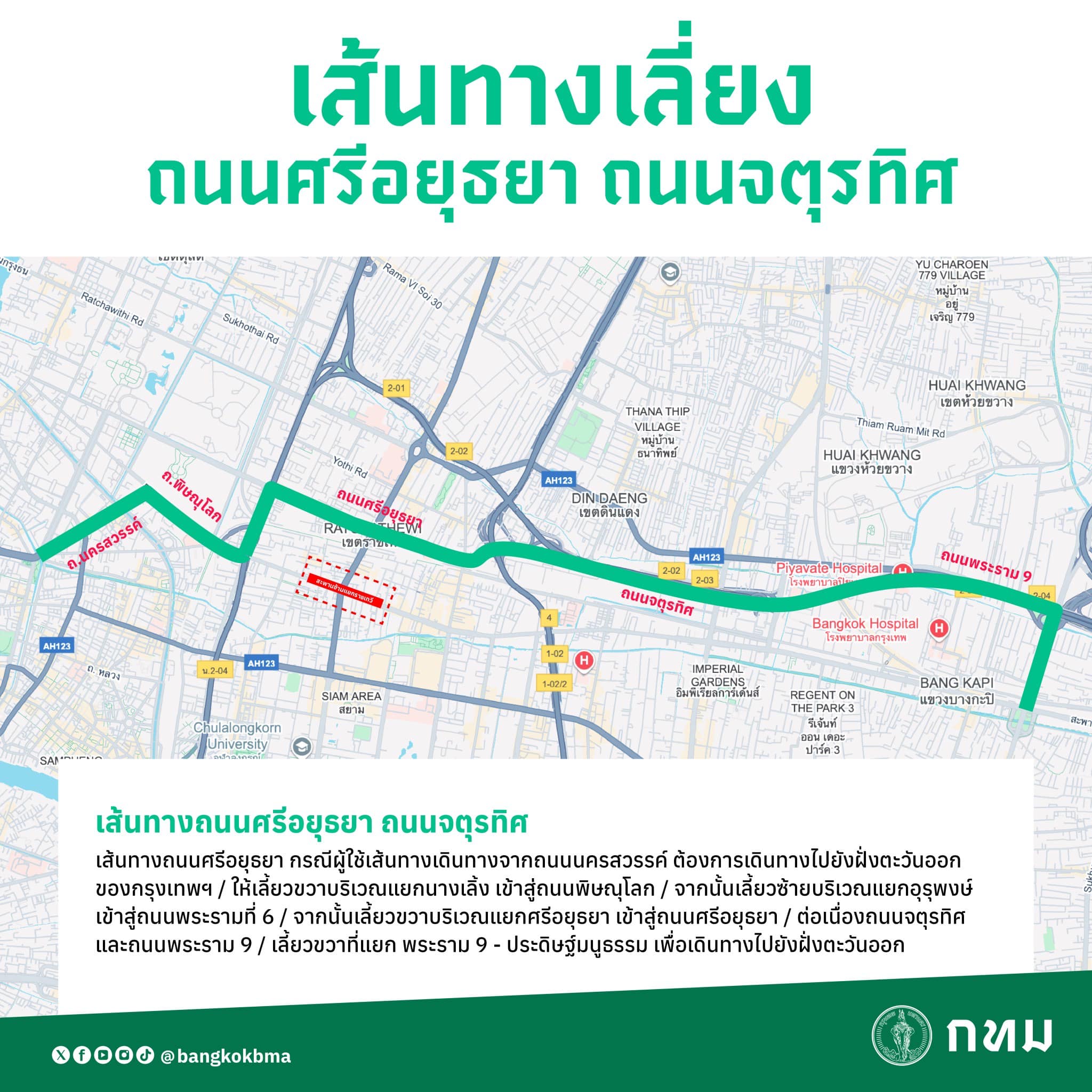 ナコンサワン通りから来る車両は、ナーンルアン交差点で右折してピッサヌローク通りに入り、ウルポン交差点で左折してラマ6世通りに入り、シーアユタヤ交差点で右折してシーアユタヤ通りに入り、チャトゥラティット通りとラマ9世通りを経由してプラディットマヌタム通りに右折するよう案内されています。