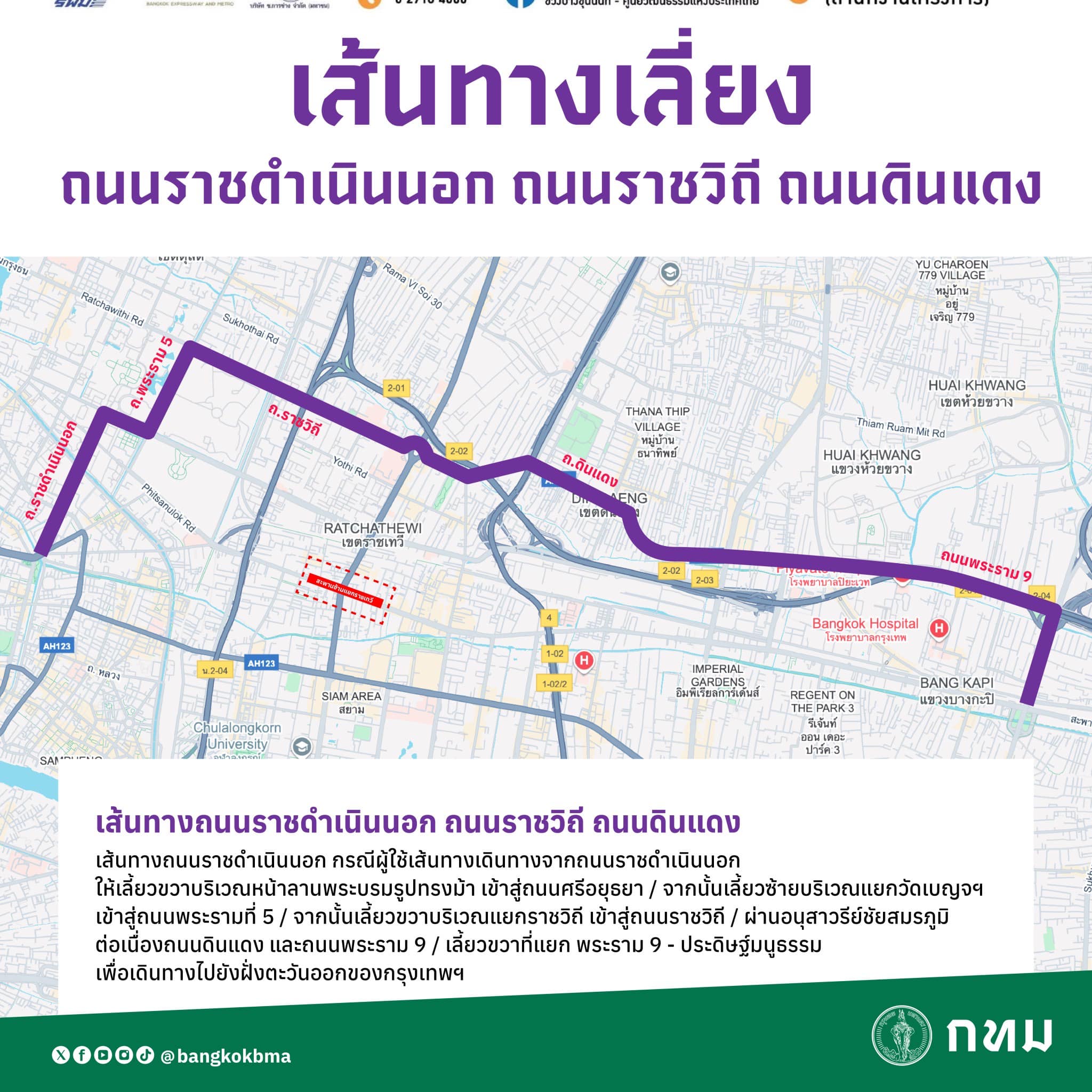 ラーチャダムヌーンノーク通りから来る車両は、エカスリアン像で右折してシーアユタヤ通りに入り、ベンチャマボピット寺院交差点で左折してラマ5世通りに入り、ラーチャウィティ通りで右折し、ビクトリーモニュメント(戦勝記念塔)を回り、ディンデーンとラマ9世通りを経由してラマ9世交差点で右折してプラディットマヌタム通りに向かうよう推奨されています。