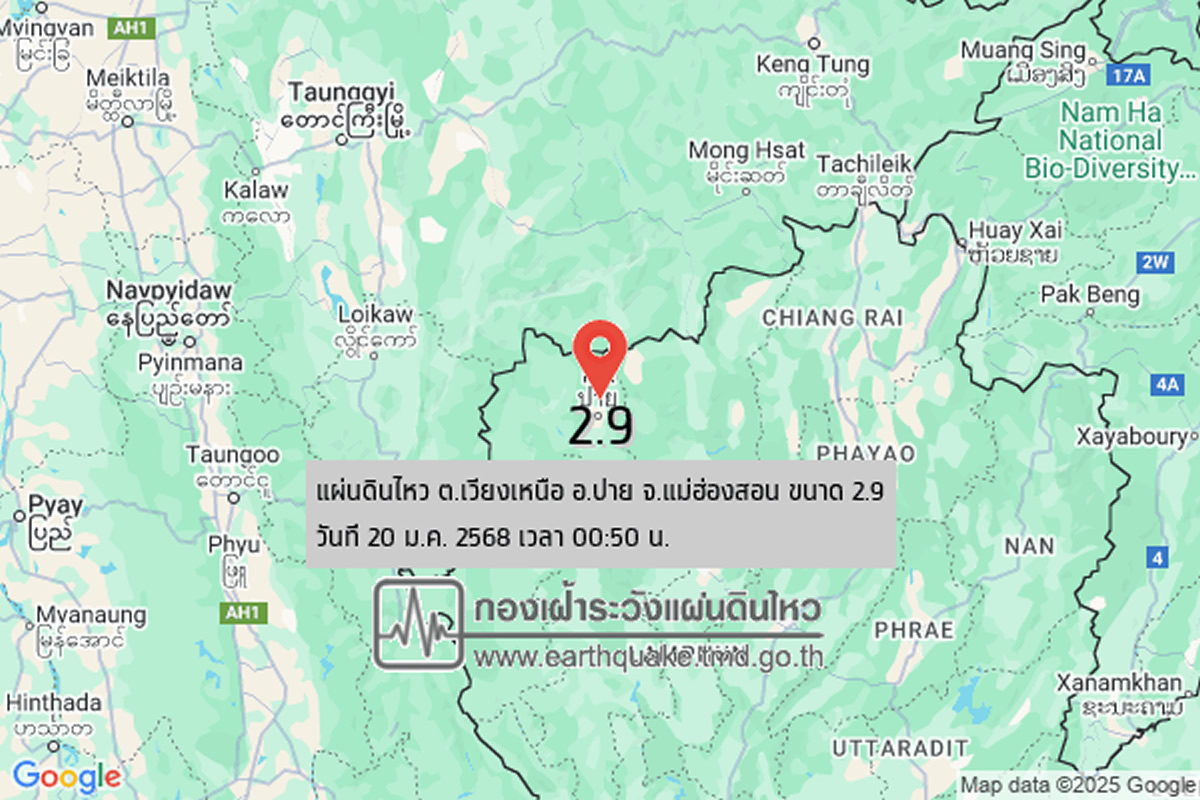 タイ北部メーホンソン県災害防止軽減事務所は、2025年1月19日から20日にかけてパーイ郡で一連の地震が発生したと発表しました。タイ地震学局によると、最初の地震は1月19日午後9時5分にウィアンヌア地区で発生し、マグニチュード2.8、深さ4kmが記録されました。その後も複数の揺れが観測され、マグニチュードは1.8から3.4の範囲で、最も浅い震源の深さは1kmとされています。タイ国営メディアNNTが伝えています。