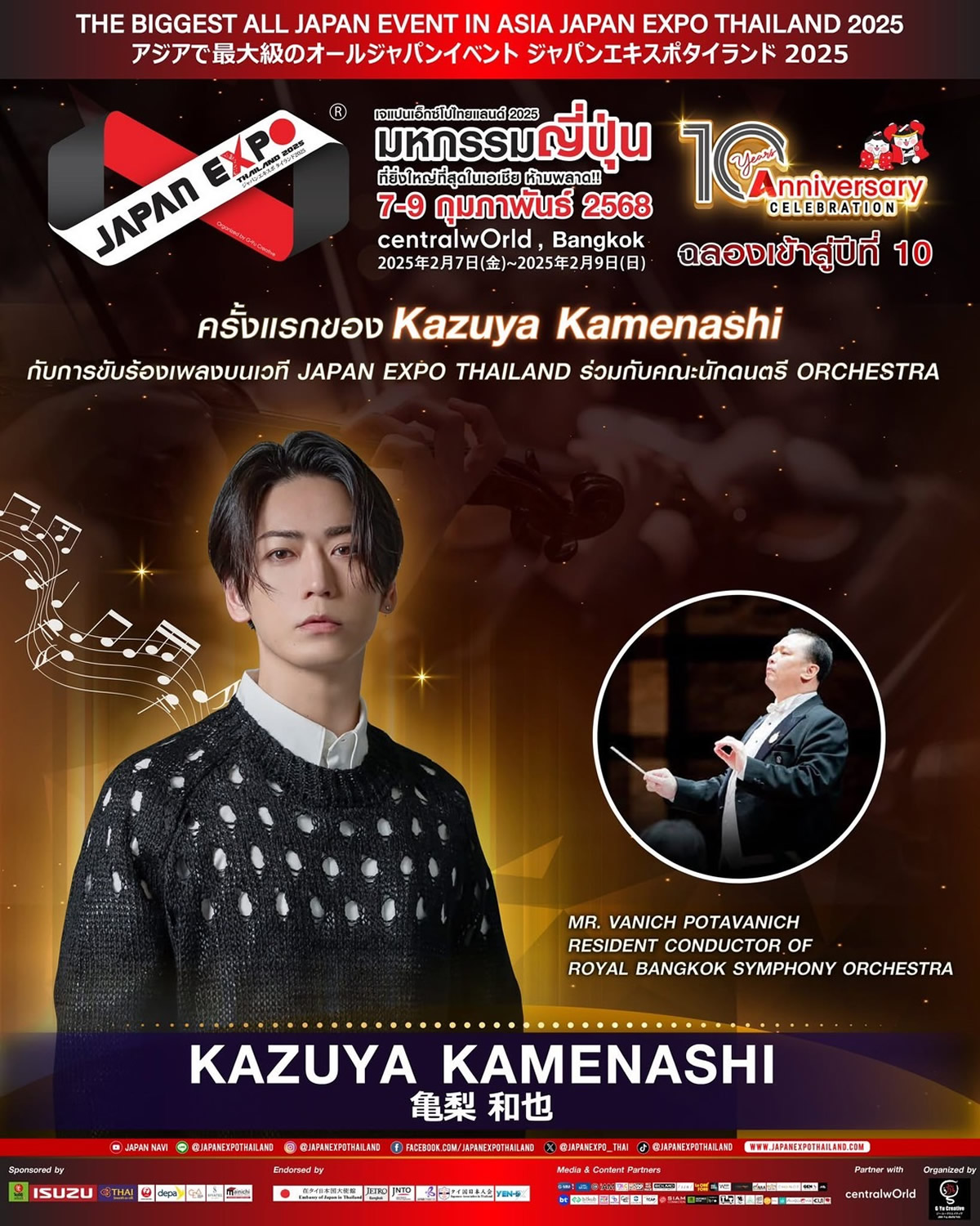 アジア最大級の日本イベントとして知られる「JAPAN EXPO THAILAND」の10周年記念イベントに、俳優・歌手として活躍する亀梨和也が参加。このイベントは 2025年2月7日(金)から9日(日) の期間中、バンコクのセントラルワールドにて開催されます。主催はG-YU CREATIVE社で、OISHI、いすゞ、タイ国際航空、日本大使館、国際交流基金、日本政府観光局(JNTO)、日本貿易振興機構(JETRO)、タイ日本人会、タイ創造経済振興機構(CEA)など、多くの政府機関・民間団体が協力しています。