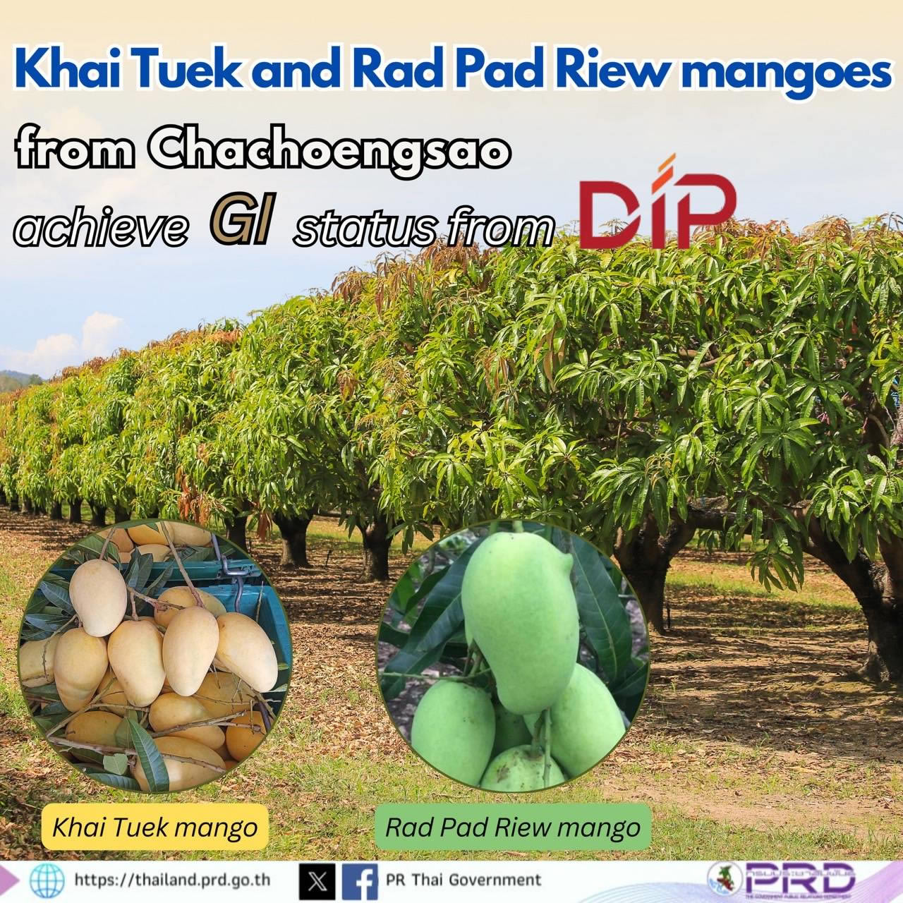 タイ商務省知的財産局は、タイ中部チャチューンサオ県の特産品であるマンゴーの「Khai Tuek Pad Riew」と「Rad Pad Riew」を地理的表示(GI)産品として正式に登録しました。これにより、すでに認定されている「Nam Dok Mai See Thong Bang Khla」マンゴー(Barracuda mango)、「Bang Khla aromatic coconut」、「Pad Riew Khiew Sawoey」マンゴーに続く新たな地理的表示(GI)産品が誕生しました。2025年1月30日のタイ広報局が伝えています。