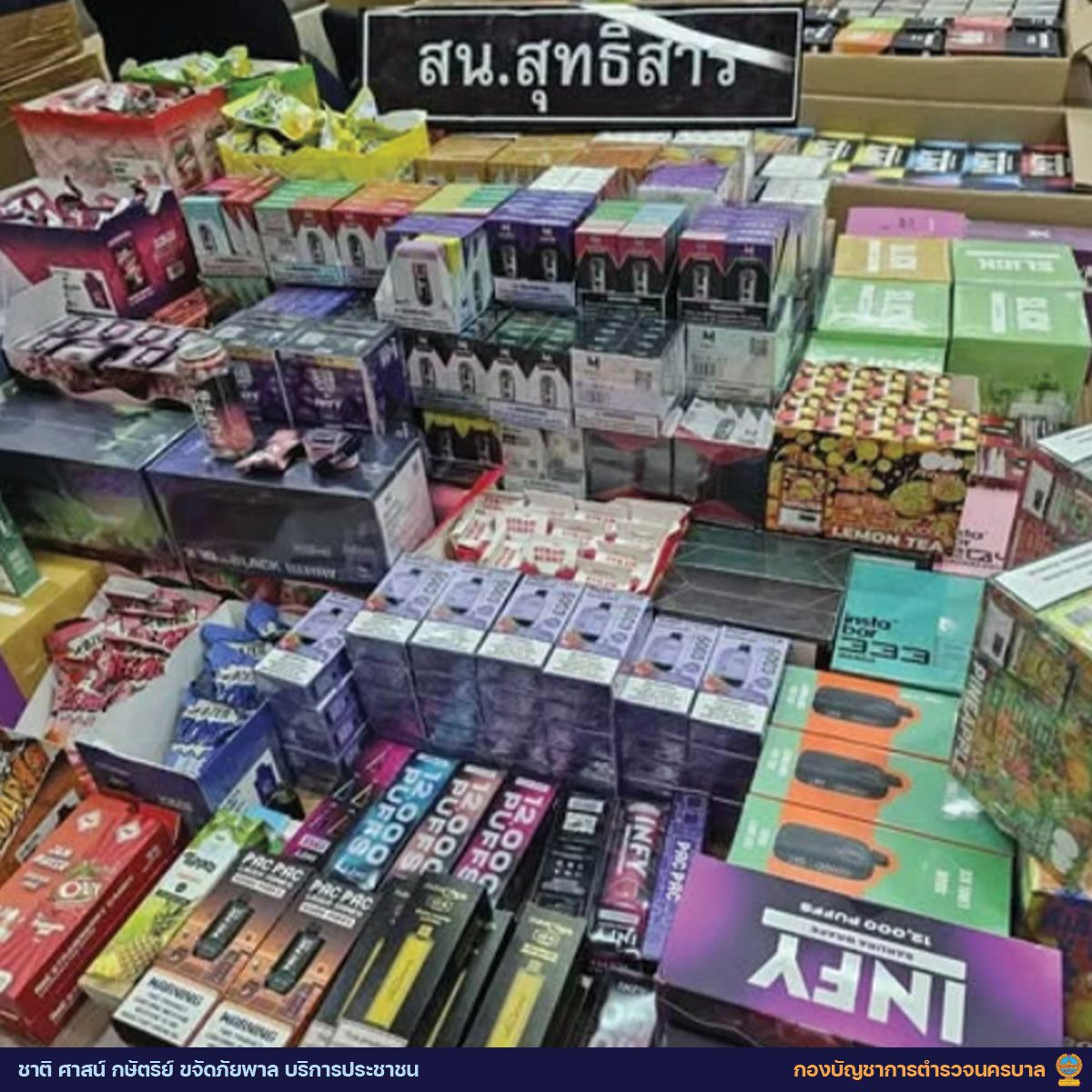 警察は、スティサーン署管内で電子タバコが違法に販売されているとの情報を入手し、ラプラオ通り12のコンドミニアム駐車場を張り込んでいました。現場では、2人の男が車から降りる様子が確認され、さらに別の男女2人が周囲に立っていたため、職務質問を行いました。車の荷台から使い捨て電子タバコ854本が見つかり、4人が関与を認めたことから、コンドミニアムの部屋を捜索。その結果、電子タバコ5,558本、リキッドカートリッジ23,780個、吸引機14台を含む合計30,206点(総額500万バーツ以上)が押収されました。