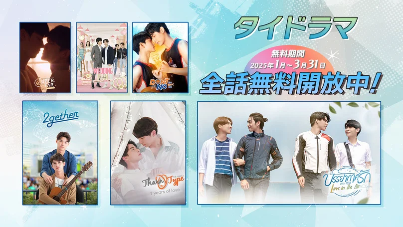 NTTドコモが運営する動画配信サービス『Lemino』(レミノ)では、タイの人気ドラマ6作品が2025年3月末まで全話無料で配信されています。「2gether」や、「Love in The Air」「Wedding Plan -新郎のイジワルな恋愛計画-」といった話題作がラインナップされています。