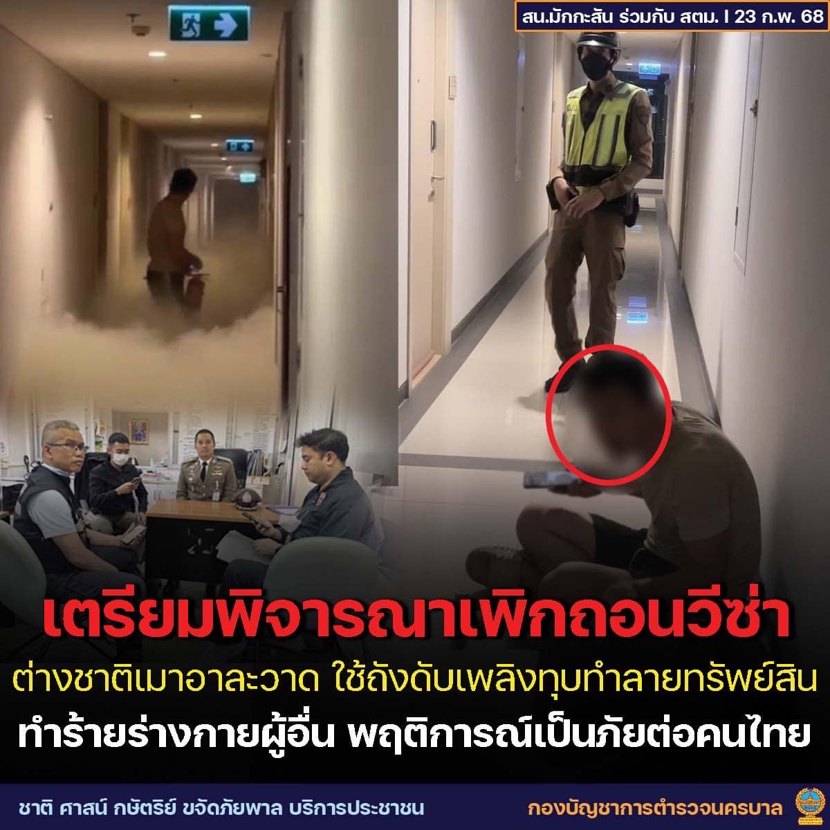 また、警察が男のパスポートを確認したところ、男は観光ビザで3月25日までタイに滞在可能であることが判明しました。コンドミニアムの部屋の所有者は、男がその部屋に住んでいることを1979年入国管理法第38条に基づき、入国管理局に報告していました。男の行為が居住者に対する脅威であることから、入国管理局はビザの取り消しを検討しており、マッカサン署が刑事事件の手続きを進める一方で、入国管理局本部にビザ取り消しの審査を要請する予定です。