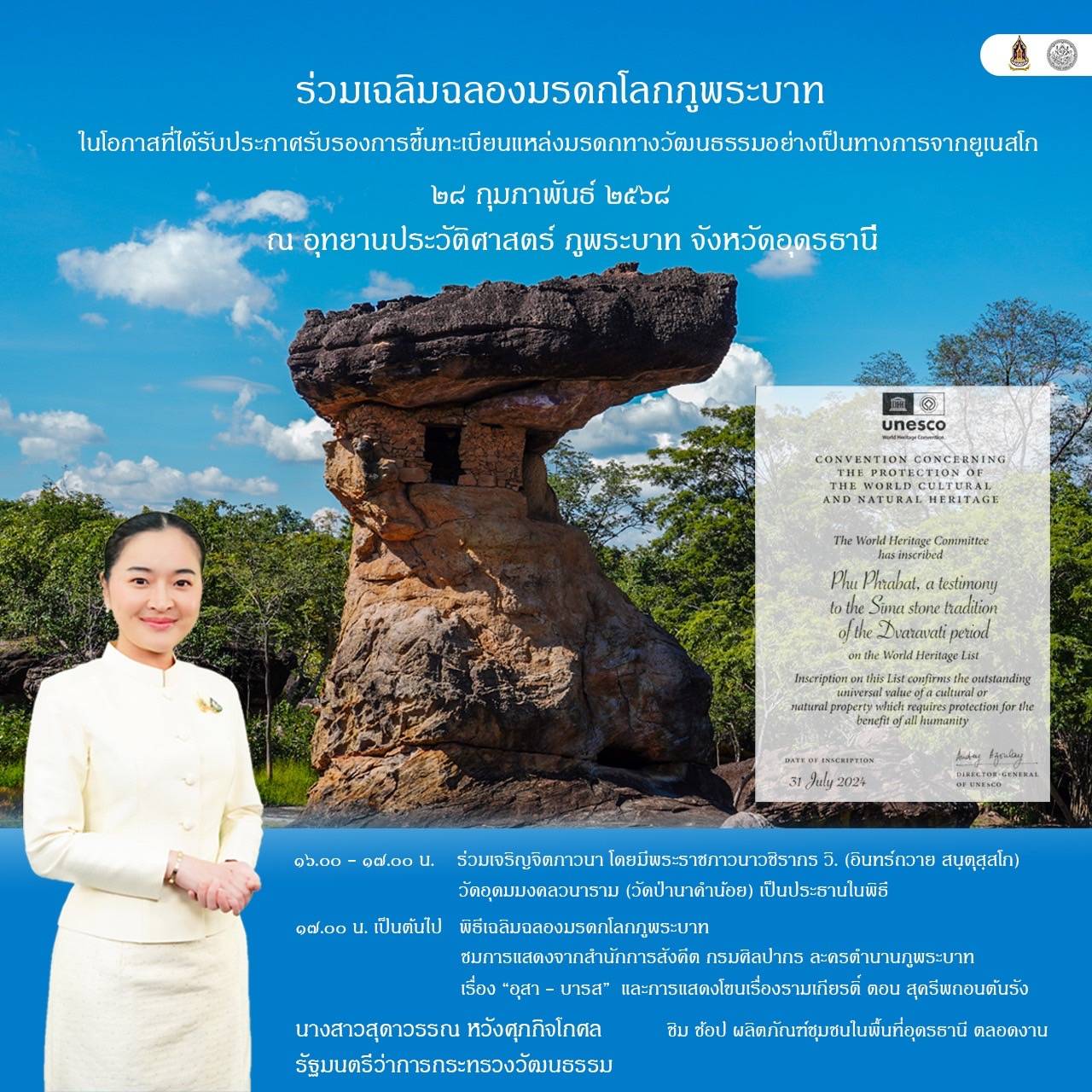 タイ東北部ウドンタニ県に位置するプー・プラ・バート歴史公園が、2024年7月27日にユネスコの世界文化遺産として正式に登録されました。これを記念し、2025年2月28日に同公園にて盛大な祝賀イベントが開催されます。