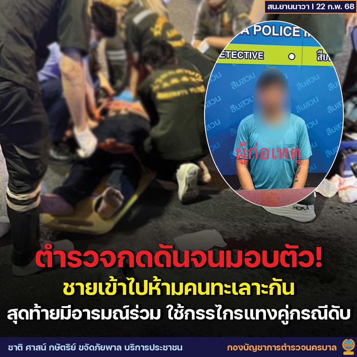 警察によりますと、21日午後7時58分、イサーンソーセージ(サイクロークイーサーン ไส้กรอกอีสาน)を販売する露天商同士が口論となり、暴行事件が発生したと通報がありました。通報を受けた警察が現場に急行したところ、負傷者1人が左胸下に刺し傷を負い、現場から約100メートル離れた道路上に倒れているのを発見しました。