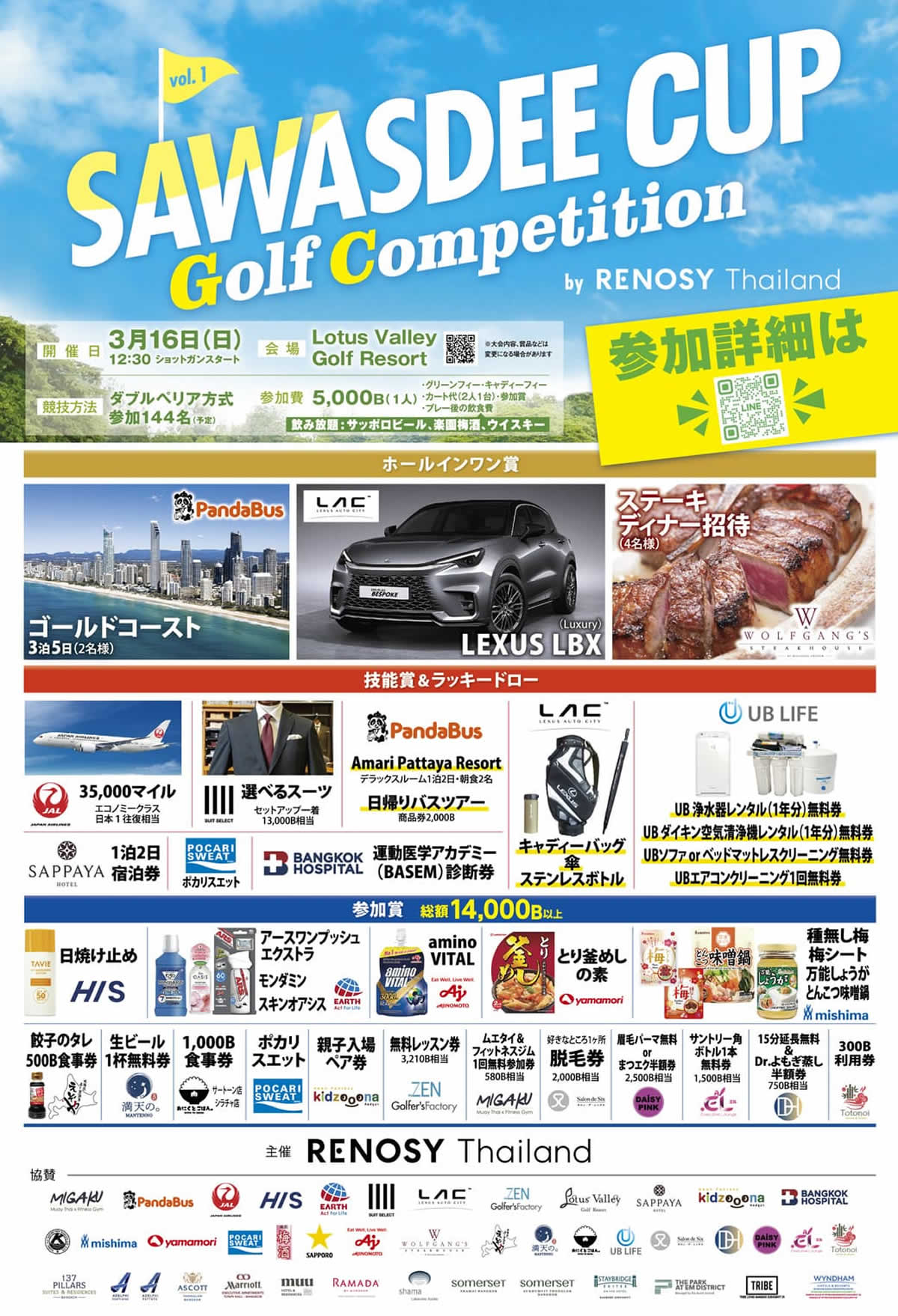 コロナ前には2000名以上の応募が殺到していたタイ最大級の日系ゴルフコンペが「Sawasdee Cup Golf Competition by RENOSY Thailand」として復活。2025年3月16日(日)にLotus Valley Golf Resortで開催されます。参加費用は1名5,000Bで、4名1組での応募となります。